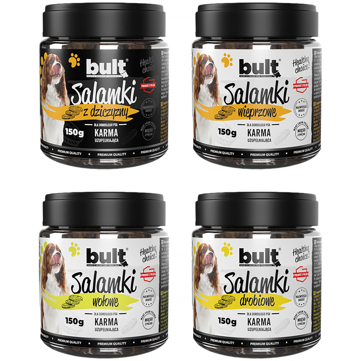 Zestaw salamków do Bult to wyjątkowe smakołyki dla psa w różnych smakach, które zadowolą podniebienie każdego psa. Karma uzupełaniająca dla dorosłych psów składa się z czterech różnych smaków: wołowina, dziczyzna, wieprzowina oraz drób. Różne kompozycje smakowe zapewnią różnorodność oraz ciekawe urozmaicenie diety psa.