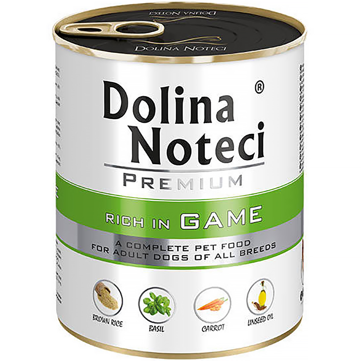 Karma mokra Dolina Noteci Premium oparta jest na mięsie wołowym, wieprzowym oraz dziczyźnie, z wysokowartościowymi dodatkami tj. olej lniany, ryż brązowy naturalny, jaja, marchewka oraz nasiona babki płesznik. Prezentowana karma mokra dla psów dorosłych jest bezglutenowa i bezzbożowa, dzięki czemu doskonała dla psów z alergiami oraz z wrażliwymi żołądkami. Dziczyzna to źródło wielu składników odżywczych tj. witamin z grupy B, żelaza oraz kwasów tłuszczowych omega-3.
