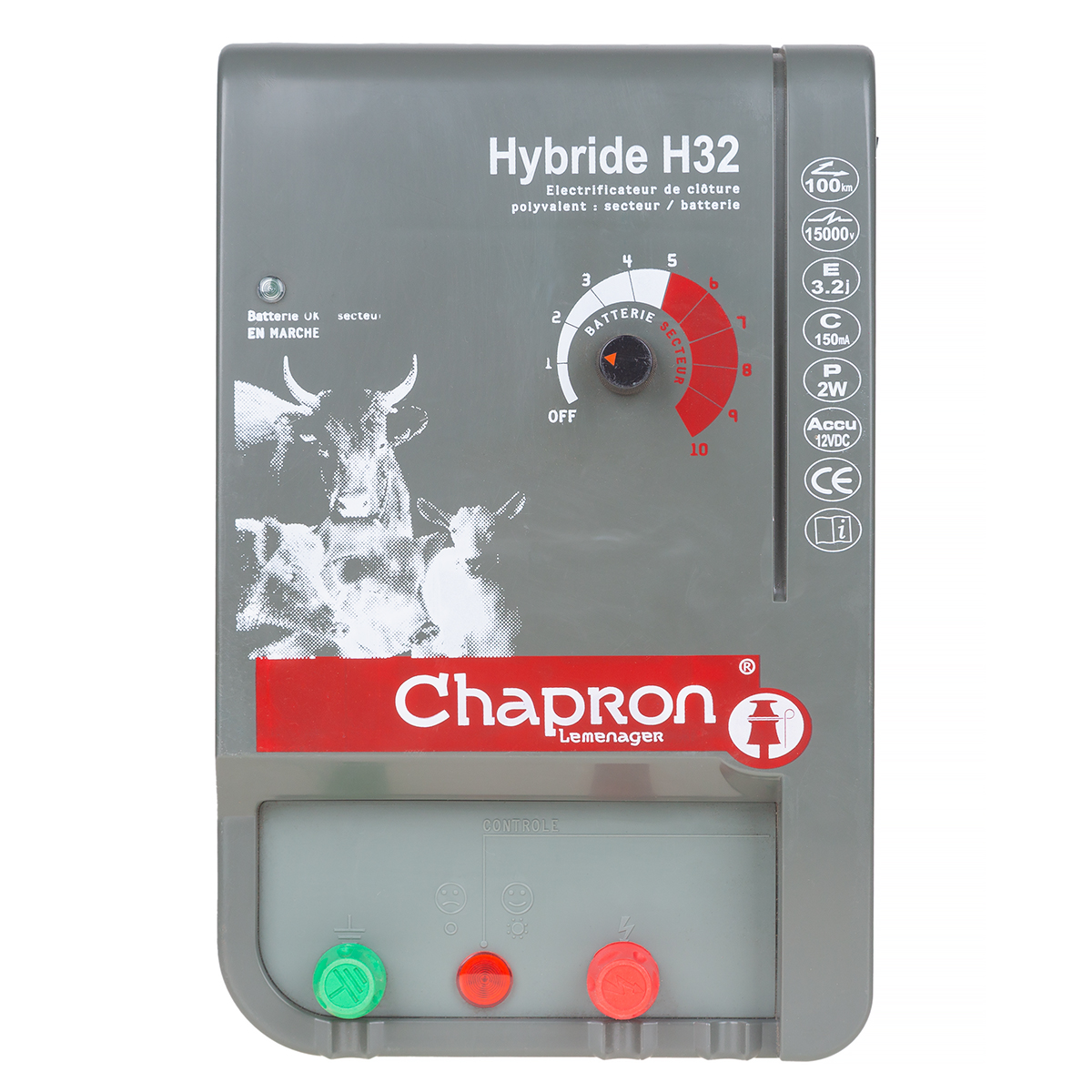 Uniwersalny elektryzator o bardzo dobrych parametrach. Typowy uniwersalny pastuch elektryczny zasilany z sieci 220/240V lub z akumulatora albo baterii. To co odróżnia ten elektryzator od innych tego typu urządzeń to duża moc impulsu 3200mJ i wysokie napięcie rozładowania impulsu 15000V. Dodatkowo elektryzator HYBRIDE wyposażony jest w płynny regulator mocy wyładowania co czyni urządzenie jeszcze bardziej uniwersalnym.Pastuch elektryczny zbudowany w oparciu o Elektryzator Chapron HYBRIDE może służyć do dyscyplinowania i ochrony wszystkich gatunków zwierząt począwszy od gatunków wrażliwych skończywszy na odpornych narowistych zwierzętach. Ze względu na moc impulsu elektrycznego (3,2 J - najmocniejszy pastuch akumulatorowy na rynku) bardzo chętnie wykorzystywany jest do ochrony upraw przed dzikimi zwierzętami w miejscach gdzie nie ma możliwości podłączenia do gniazda sieciowego 220/240V. Zintegrowany w urządzeniu płynny regulator mocy jest niezastąpiony w miejscach gdzie konieczna jest częsta regulacja mocy energii impulsu elektrycznego. Funkcja ta jest doceniana głównie przez hodowców koni, gdzie padoki często służą koniom w różnym wieku, oczywistym jest, iż źrebaki czy kobyły źrebne nie mogą być dyscyplinowane zbyt dużym impulsem elektrycznym w przeciwieństwie do narowistych starszych osobników.