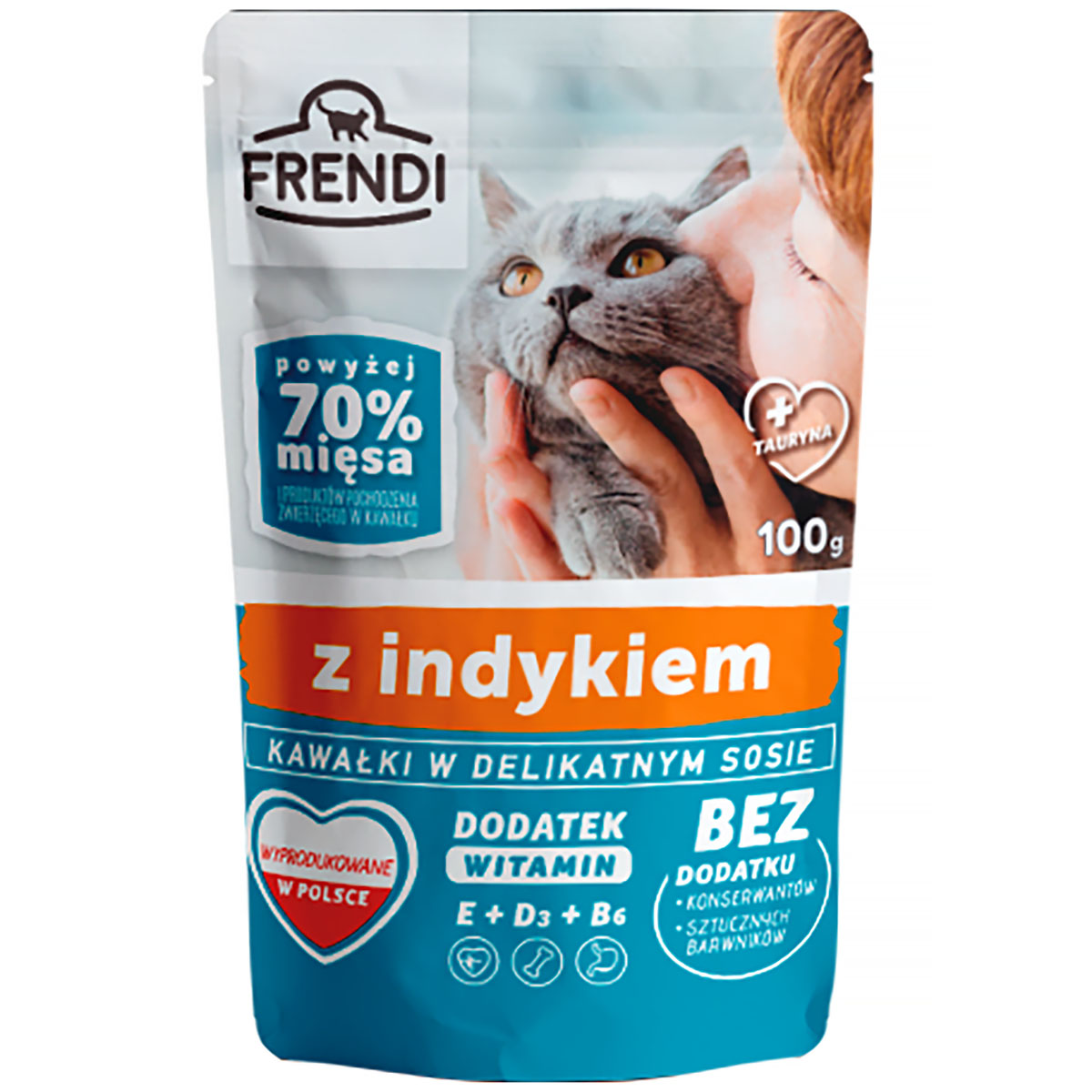 FRENDI to mokra karma dla kota zamknięta w wygodnej saszetce o pojemności 100 g. W saszetce znajdują się delikatne kawałki indyka, zalane sosem. Saszetka FRENDI 100 g stanowi pełnoporcjowe pożywienie naszych pupili. Karma FRENDI jest bardzo chętnie zjadana przez koty.