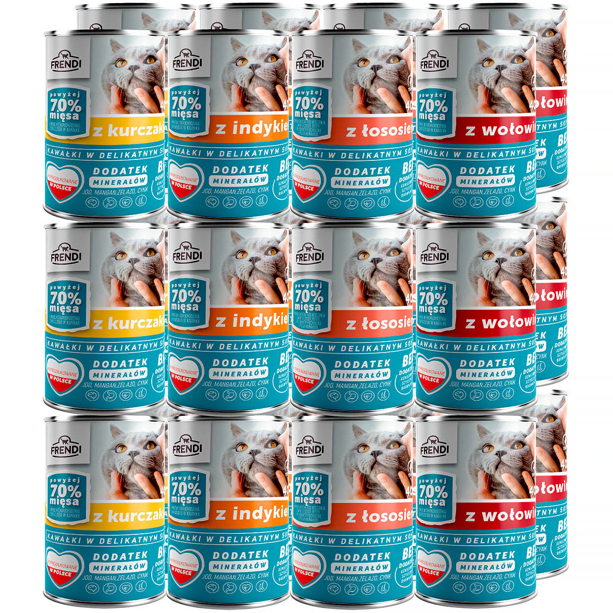 FRENDI mokra karma dla kota mix smaków zestaw 24 x 400 g to odpowiednio zbilansowany posiłek, który zaspokaja potrzeby żywieniowe dorosłych kotów. Zestaw składający się łącznie z 24 puszek o różnych smakach to gwarancja różnorodności karmy, która szybko się nie znudzi i z chęcią będzie zjadana przez koty. Puszki dla kota składają się z różnych smaków takich jak kurczak, indyk, wołowina, czy łosoś i każda zawiera minimum 70% mięsa i składników pochodzenia zwierzęcego w każdy kawałku!