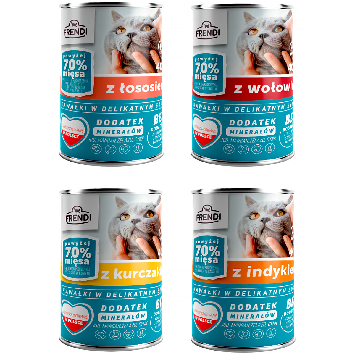 Karma Frendi to propozycja pełnowartościowego pokarmu dla twojego kota. Karma jest przeznaczona dla kotów dorosłych każdej rasy. Zestaw karmy w puszkach to bardzo wygodna forma zamknięcia pokarmu, która zapewnia świeżość i wyjątkowy smak. Karma Frendi ma postać kawałków mięsa, które połączone są sosem, tworząc apetyczny posiłek dla kota.