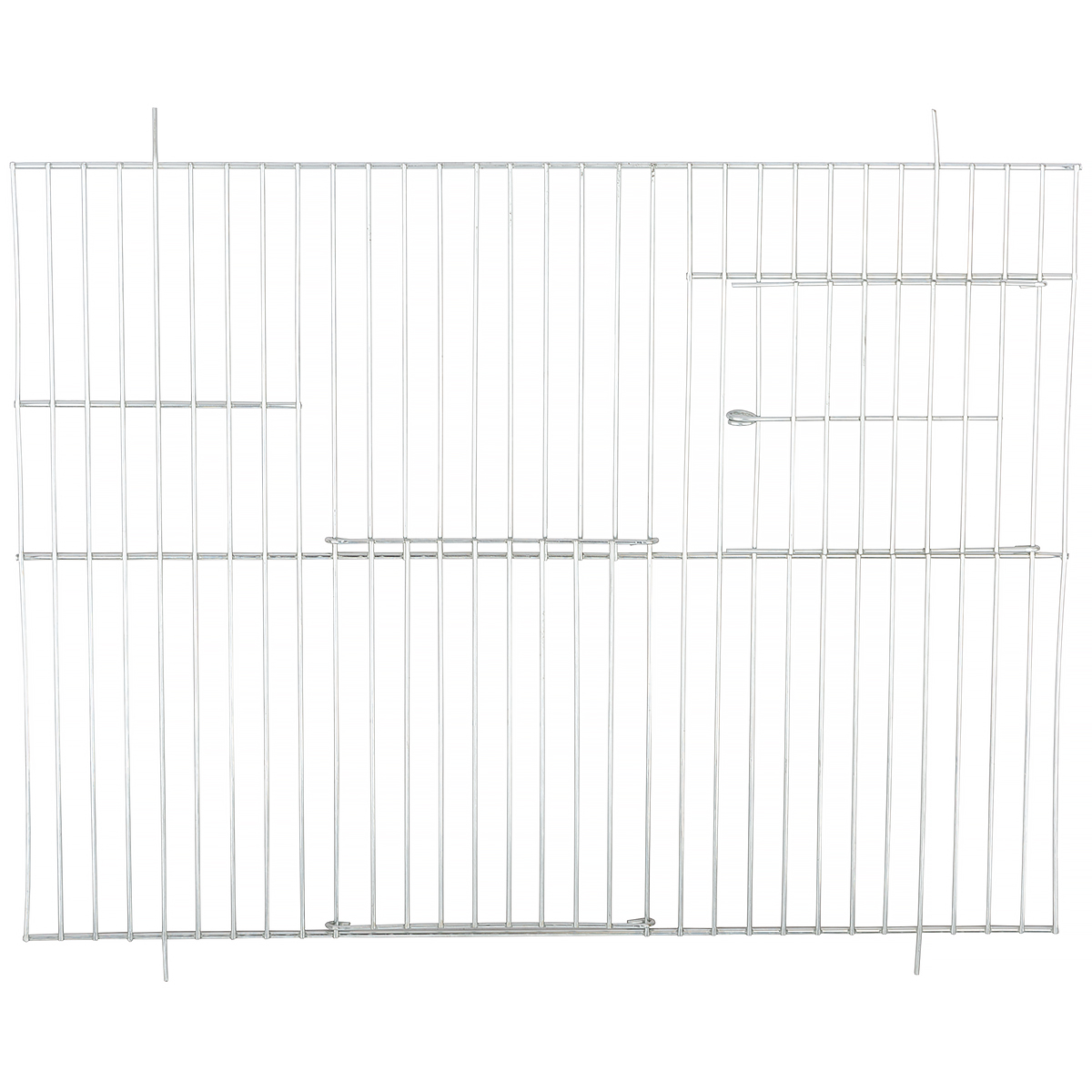Uniwersalny front do klatek dla kanarków i papug, wykorzystywany w sytuacjach, gdy hodowca buduje klatkę samodzielnie. Front do klatek dla papug posiada dwoje otwieranych drzwiczek. Całość wykonana z najwyższej jakości kraty zgrzewanej.Do produkcji frontu użyto drutów ocynkowanych o średnicach odpowiednie 2 mm dla drutów pionowych oraz 3 mm dla drutów poziomych. Takie parametry gwarantują solidność konstrukcji oraz długą żywotność. Wymiary: