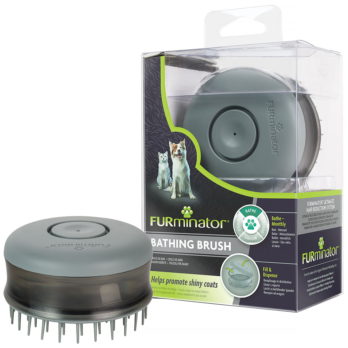 FURminator Bathing Brush to profesjonalna szczotka do kąpieli dla psów i kotów. Szczotka posiada dozownik szamponu, który zdecydowanie ułatwia kąpiel zwierząt.