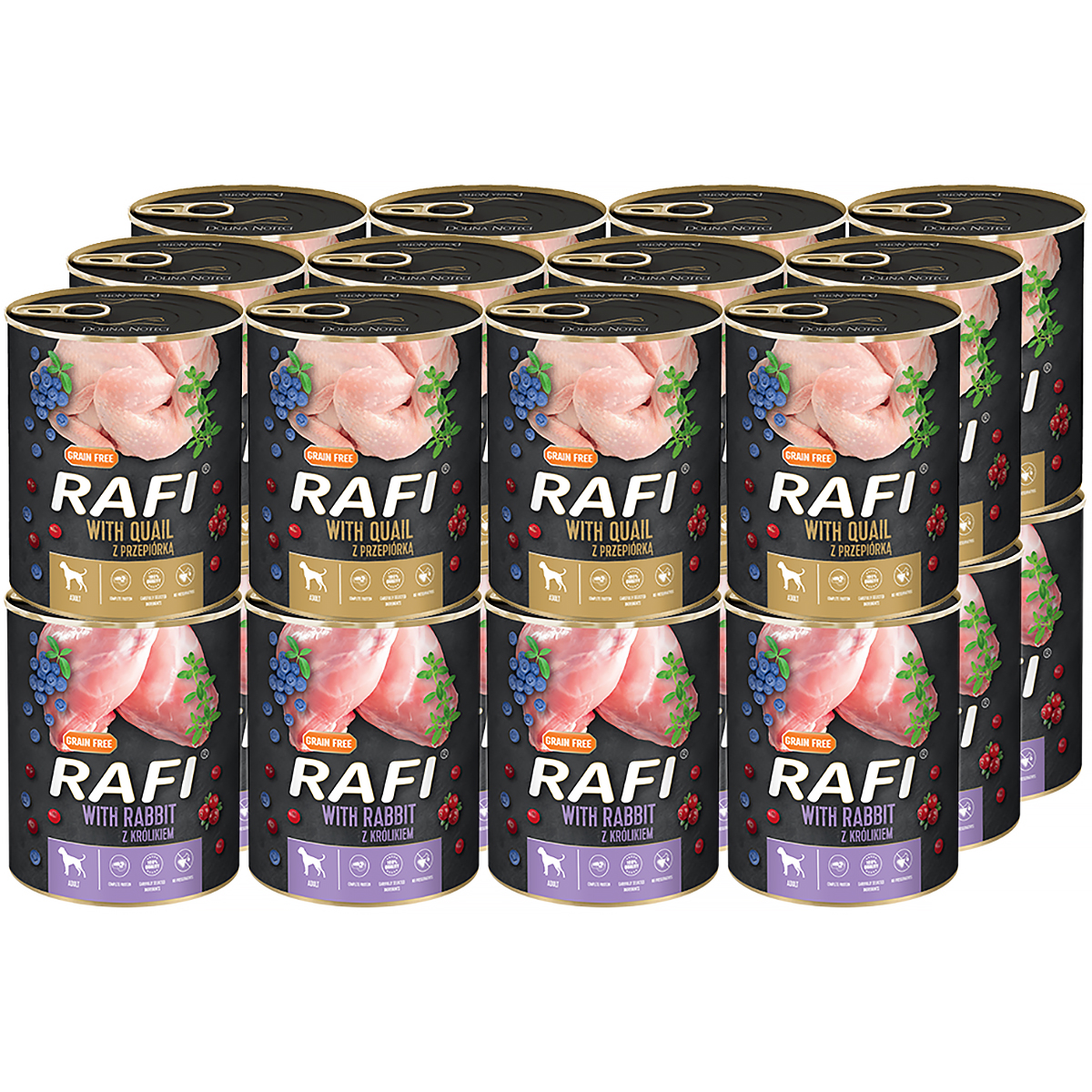 Zarówno mięso królika jak i przepiórki zawarte w karmie Rafi jest głównym źródłem wysokowartościowego białka oraz kwasów tłuszczowych z rodziny n-3 i n-6. Mięso z królika i przepiórki należą do gatunku mięs dietetycznych. Dostarczają dużą zawartość protein przy niewielkiej ilości tłuszczu i cholesterolu, co pozwala utrzymać prawidłową kondycje fizyczną czworonogów. Zestaw Rafi o smaku królika i przepiórki polecamy dla dorosłych psów z nadwagą, lub dla psów które przebywają na specjalnej diecie zdrowotnej. Brak zawartości zbóż oraz sztucznych konserwantów i wzmacniaczy smaku sprawia, że pokarm dla psów Rafi może być stosowany u zwierząt z nietolerancja glutenu.