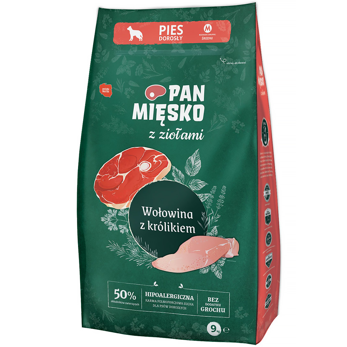 Sucha karma dla psa PAN MIĘSKO z ziołami wołowina z królikiem to hipoalergiczna karma dostosowana do potrzeb żywieniowych dorosłych psów z alergiami lub nietolerancjami pokarmowymi. Oprócz pysznego smaku gwarantuje dbałość o zdrowie i dobrą kondycję Twojego pupila. Karmienie psa suchą karmą niesie za sobą mnóstwo korzyści. Pomaga to usuwać kamień nazębny i dbać o ogólną higienę jamy ustnej.