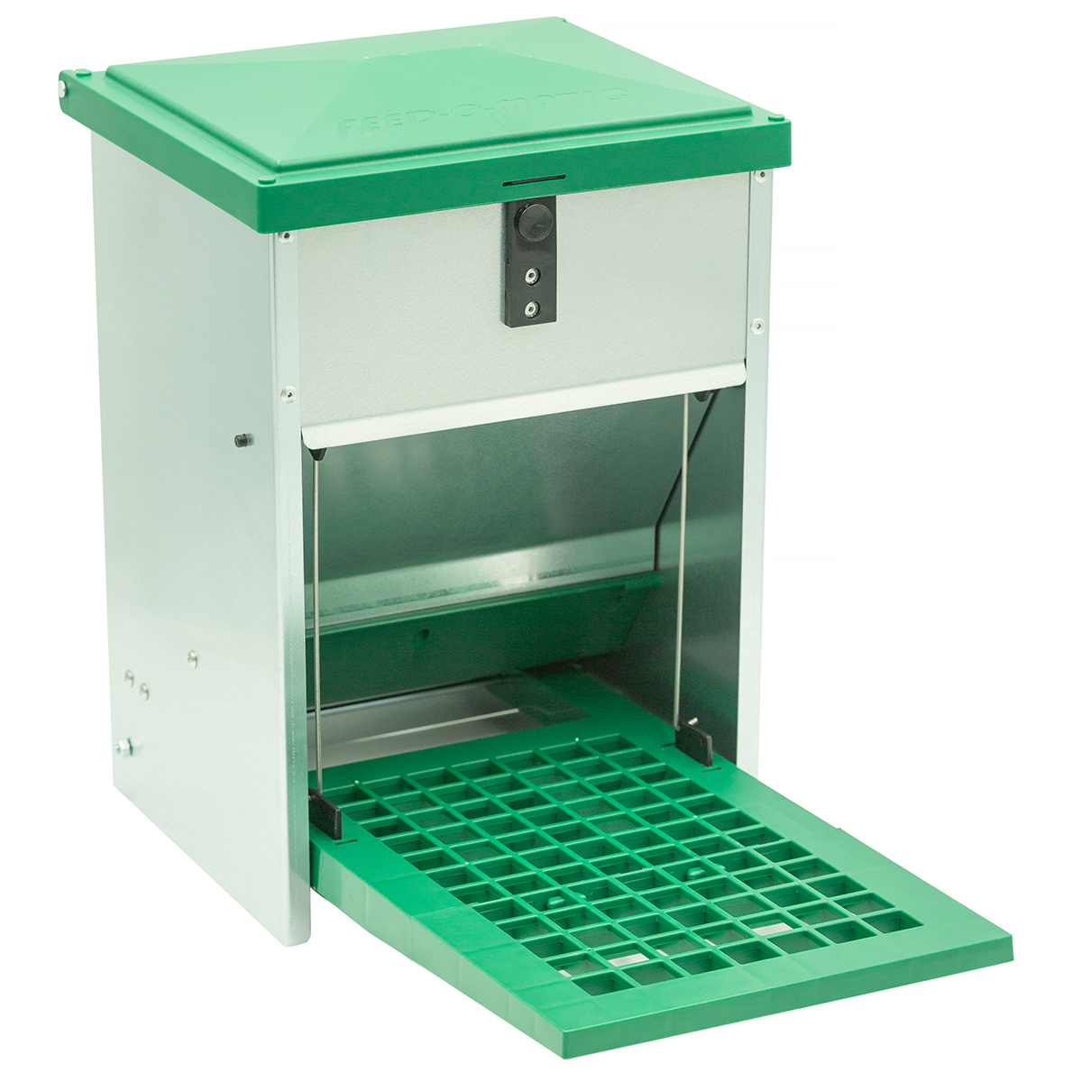 Karmidło Feed-Saver zostało skonstruowane aby dostęp do paszy miały tylko ptaki hodowlane. Posiada podest, który otwiera podajnik w momencie gdy stoi na nim ptak. Zapadka otwierająca podajnik posiada regulację nacisku i można ją dostosować do wagi ptaków.