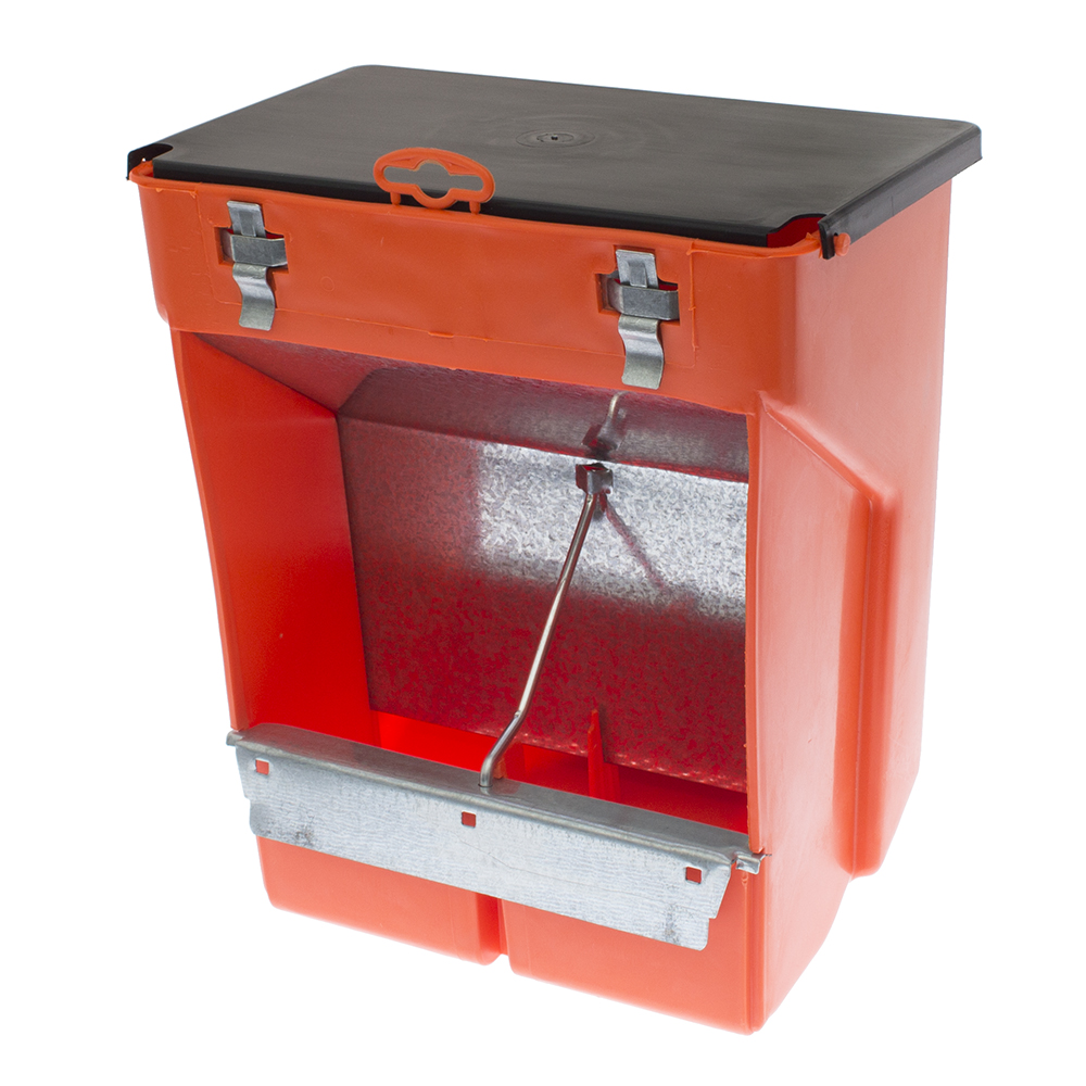 Dwukomorowa budowa karmidła pozwala jednocześnie na dostęp do paszy dla dwóch królików. Dzięki przegrodzie, króliki będą miały ograniczoną możliwość przeszkadzania sobie na wzajem podczas poobierania paszy. Można też zamontować karmidło na łączeniu dwóch klatek. Wtedy każda komora będzie podawała paszę do innej klatki. Pokrywka zabezpieczy paszę zgromadzoną w dozowniku karmidła przed dostępem dzikich gryzoni lub innych zwierząt. Jeśli klatka nie jest ustawiona pod dachem zabezpieczy ona paszę w karmidle przed deszczem.