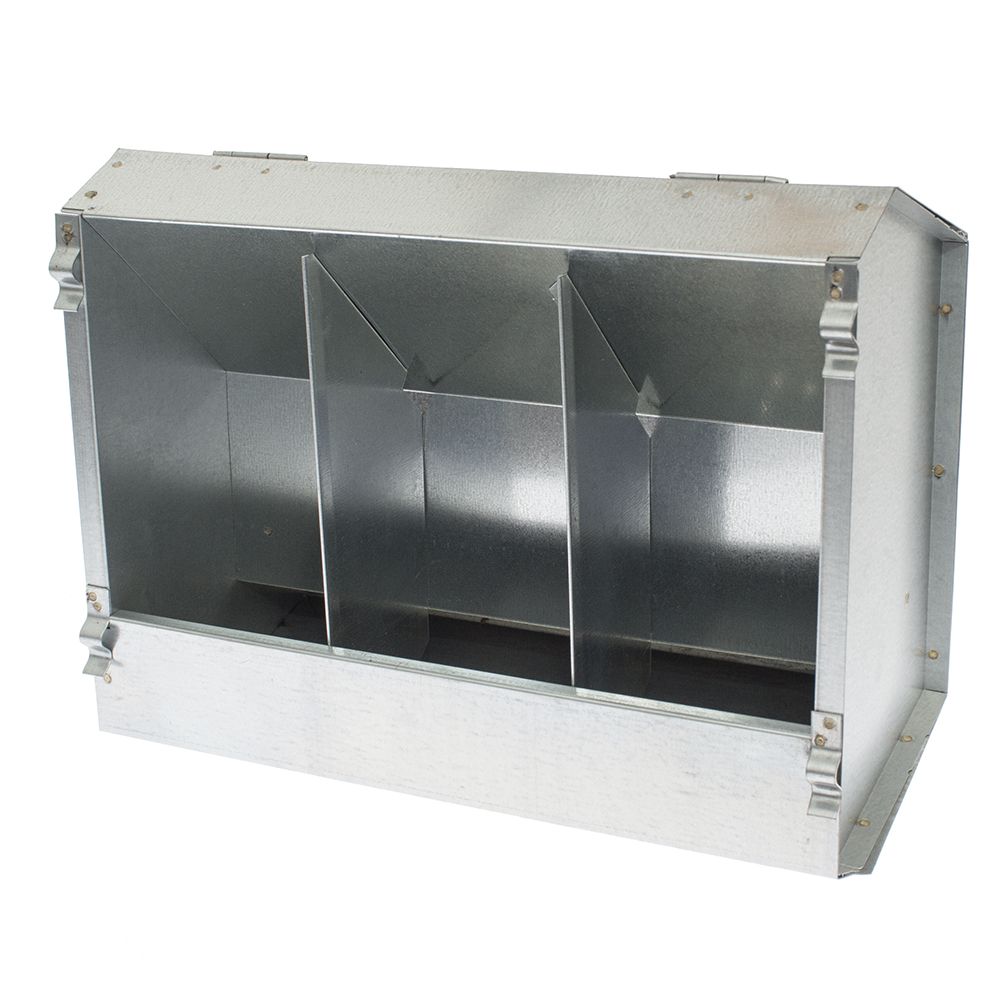 Trzykomorowy karmnik dla królików wykonany z blachy ocynkowanej z pokrywką zabezpieczającą przed dostawaniem się do paszy zanieczyszczeń . Specjalne zaczepy metalowe ułatwiają montaż, perforacje w spodzie karmidła ułatwiają samooczyszczanie się paszy.