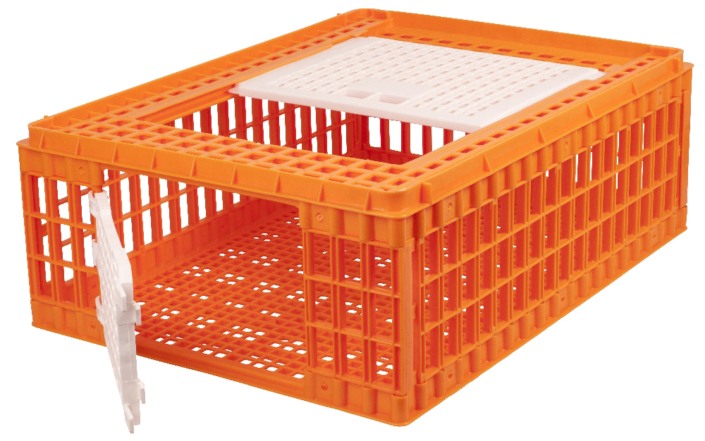 Mocna i solidna, profesjonalna klatka do transportu drobiu żywego. Klatka wykonana jest z najwyższej jakości tworzywa sztucznego odpornego nie działanie niekorzystnych czynników jak promieniowanie UV, temperatura, chemia czyszcząca. Wszystkie boki klatki są ażurowe co gwarantuje pełną cyrkulację powietrza pomiędzy klatkami nawet gdy w transporcie są składowane piętrowo jedna przy drugiej. Klatka przeznaczona jest do transportu makysmalnie 14-15 dorosłych ptaków. W ściankach bocznych posiada miejsce na chwycenie klatki oburącz dla wygodnego przenoszenia. We wnątrz klatki nie ma ostrych krawędzi co zmniejsza ryzyko niepotrzebnych okaleczeń i obtłuczeń ptaków podczas transportu. Klatka wyposażona jest w dwoje drzwiczek rewizyjnych. Jedne drzwiczki (przesuwne o rozmiarze 40 x 29 cm) znajdują się w górnej ściance. Drzwiczki te przydają się przede wszystkim do ręcznego, selektywnego wybierania lub wkładania ptaków.Drugie zaś drzwiczki (uchylne o wymiarze 30 x 19 cm) znajdują się w krótszym boku. Mogą służyć do masowego wypuszczania lub przeganiania ptaków.Drzwiczki posiadają pewny i solidny mechanizm blokujący przed niepożądanym otwarciem.Klatki są mocne i sztywne. Przystosowane są również do piętrowania na paletach. Posiadają specjalnie wyprofilowane spody i pokrywy zapobiegając ślizganiu się gdy układane są jedna na drugiej podczas transportu.