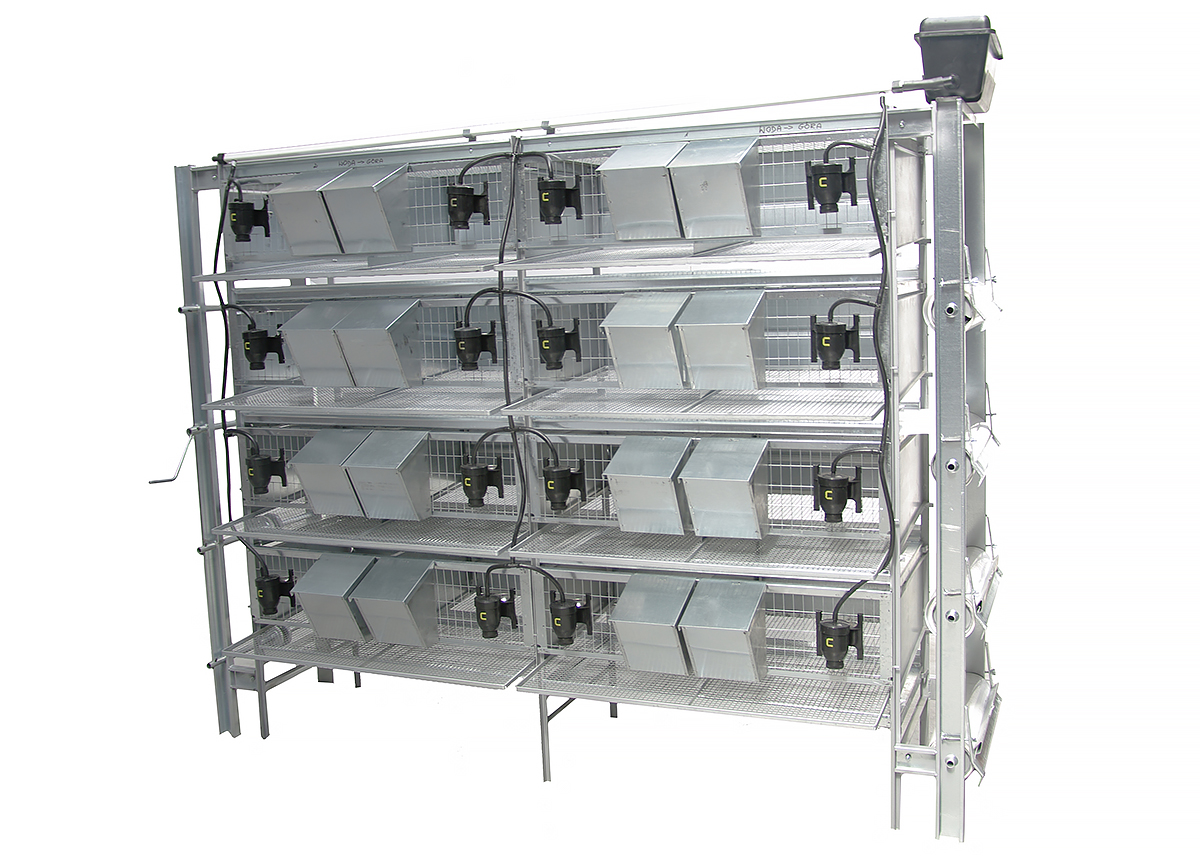 samoczynnie kulały po podłodze na zewnątrz klatki, skąd w łatwy sposób można je zbierać. Wielkość boksu dla pojedynczej pary kuropatw to około 1/4 metra kwadratowego. Dwa boksy tworzą segment o wymiarach 100 cm x 55 cm x 29 cm.Każde stanowisko dla jednej pary posiada własne