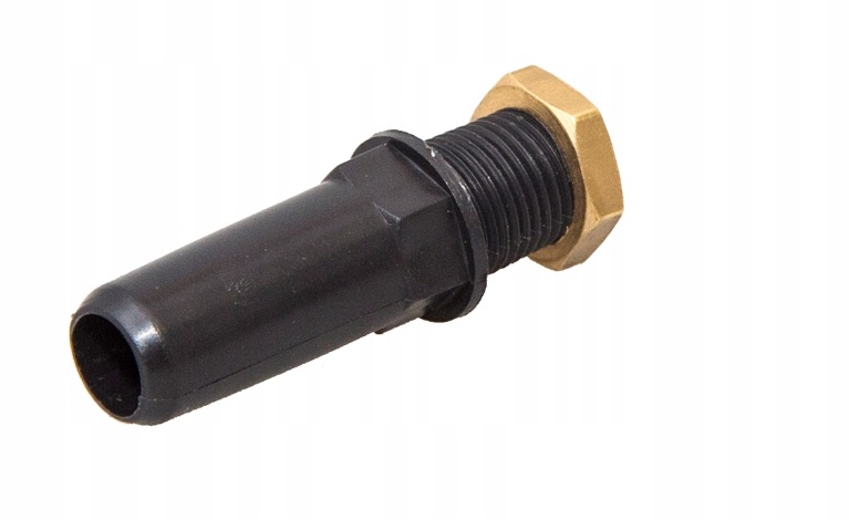 Łącznik posiada wyjście na wąż fi 10 mm, który mocuje się na wcisk. Do stabilnego przymocowania w bańce w zestawie znajduje się mosiężna nakrętka.