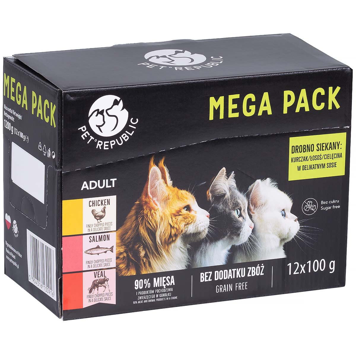 Zestaw mokrej karmy dla kotów PetRepublic 12x100 g. Pokarm dla dorosłych kotów w saszetkach zapewnia pełne pokrycie na składniki odżywcze i mineralne w codziennej diecie dorosłego kota. Mokra karma dla kota zawiera 90% mięsa z danego smaku karmy, co stanowi bogate źródło białka, składników odżywczych, witamin i minerałów.