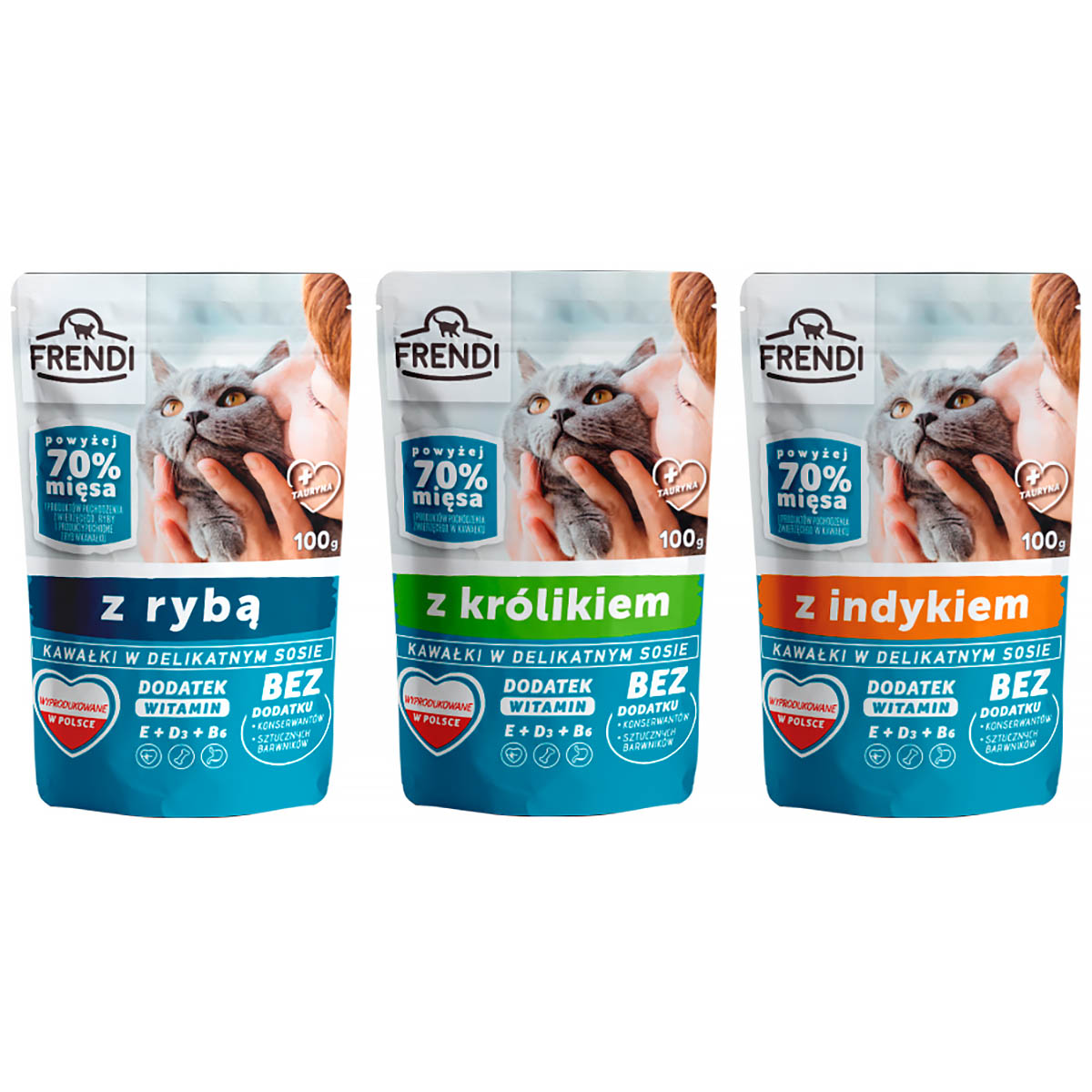 Zestaw mokrych karm dla kotów w wygodnych saszetkach 100g. Trzy różne smaki: ryba, królik, indyk. Mięsne karmy Frendi są niezwykle smaczne i koty chętnie je zjadają.