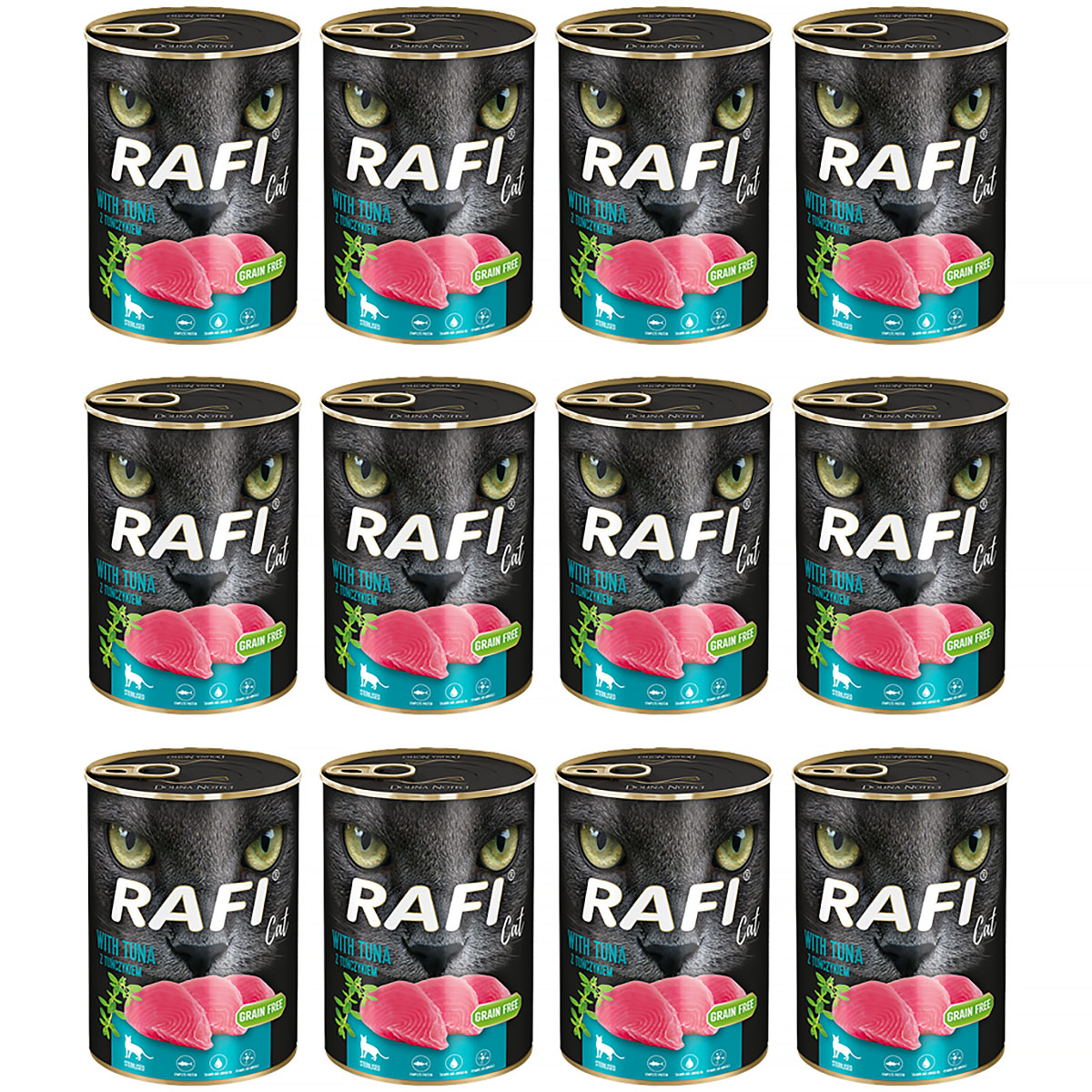 Mokra karma w puszkach dla kotów po sterylizacji. Mięsna karma RAFI z tuńczykiem kompleksowo zaspokaja potrzeby żywieniowe kotów. W zestawie znajduje się 12 puszek 400g mokrej karmy dla kota RAFI Sterilised z tuńczykiem.