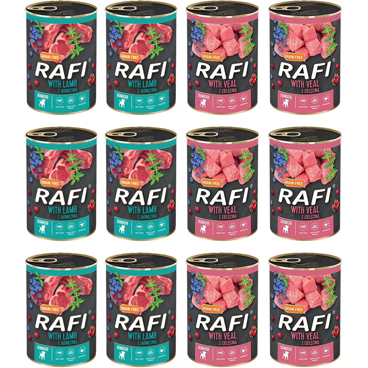 Mokra karma dla psa RAFI JUNIOR mix smaków w zestawie 12 puszek po 400 g to bogaty pakiet pełnowartościowego codziennego posiłku, opracowany z myślą o szczeniętach oraz młodych psach, które intensywnie rosną i się rozwijają. Różnorodność smakowa zawarta w zestawie uatrakcyjnia codzienną dietę pupila, ale także zapewnia cenne składniki odżywcze potrzebne do prawidłowego rozwoju.