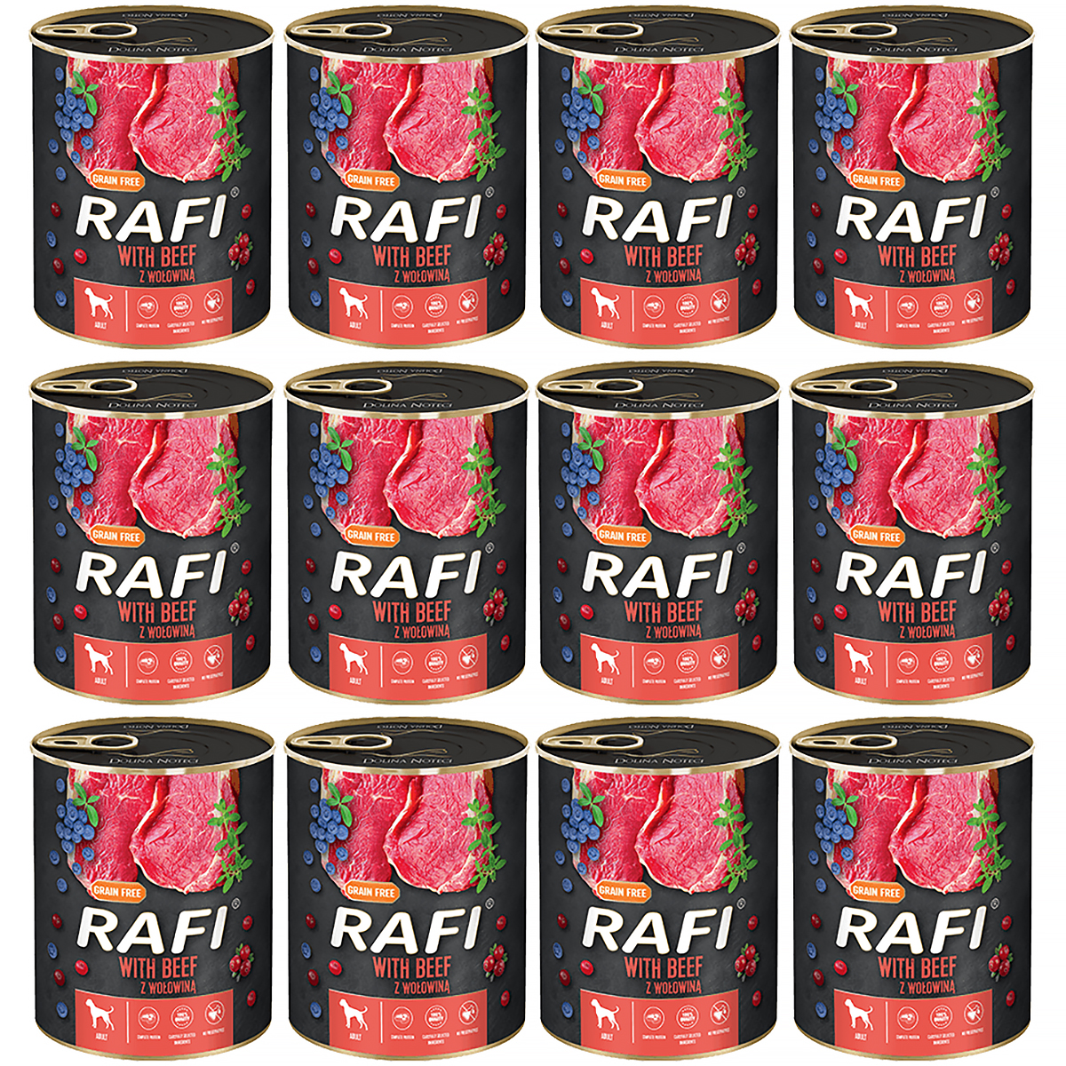 Karma dla psów Rafi z wołowiną w zestawie 12 paszek po 800 g. Karma przeznaczona jest dla dorosłych psów wszystkich ras. Bogaty smak sprawia, że psy chętnie zjadają karmę Rafi.