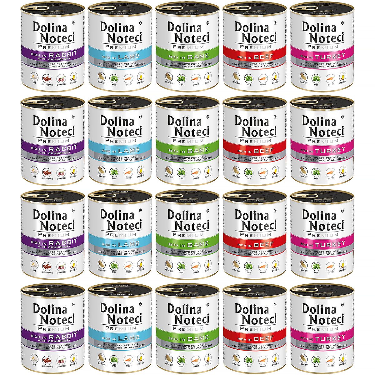 Mokra karma dla psów Dolina Noteci Premium Zestaw zawierający 20 puszek w pięciu pysznych smakach, którym żaden pies się nie oprze. Bogate w składniki odżywcze karmy z wysoką zawartością mięsa gwarantują wielką radość twojego psa przy każdym posiłku oraz zapewniają utrzymanie poprawnego poziomu zdrowia twojego pupila. Obfitość składników odżywczych wpływa pozytywnie i zauważalnie na sierść i skórę twojego psa. Karma jest przeznaczona dla dorosłych psów każdej rasy i o każdym rozmiarze. Wiele smaków karmy zawartych w zestawie sprawia, że twój pies nie musi być ograniczony do jednego smaku karmy, a rozmaitość posiłków zapewnia mu wysoki poziom witalności.