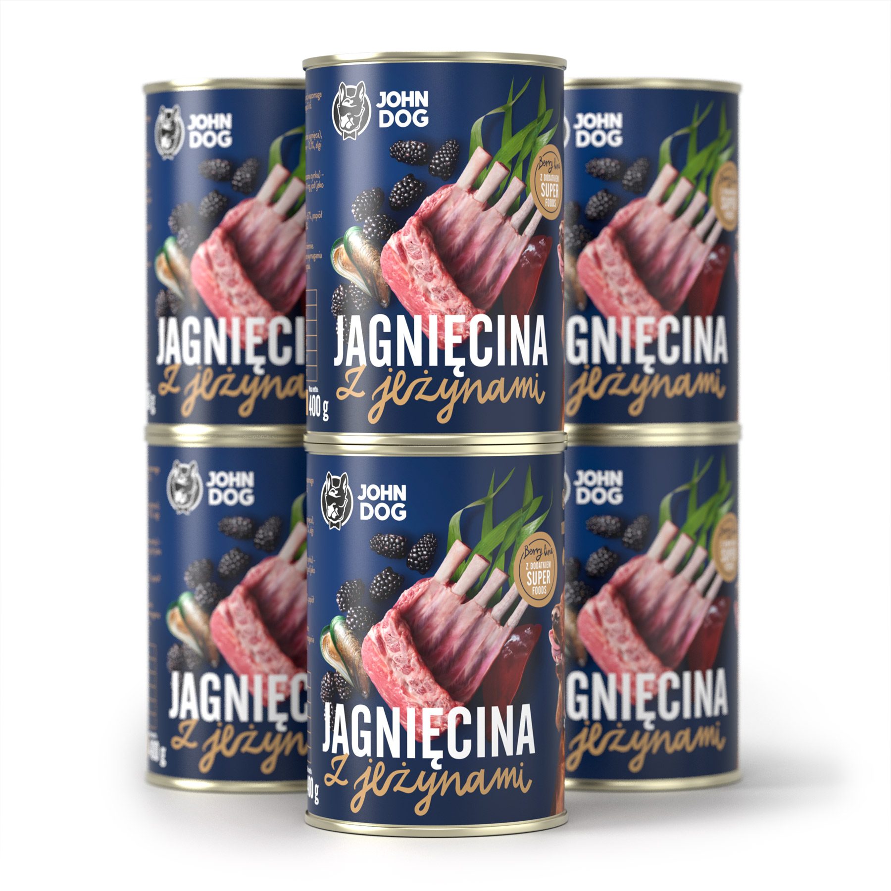 Mokra karma dla psów John Dog jagnięcina z jeżynami. W pakiecie znajduje się 6 puszek karmy o wadze 400 g każda. Karma przeznaczona jest dla dorosłych psów wszystkich ras.