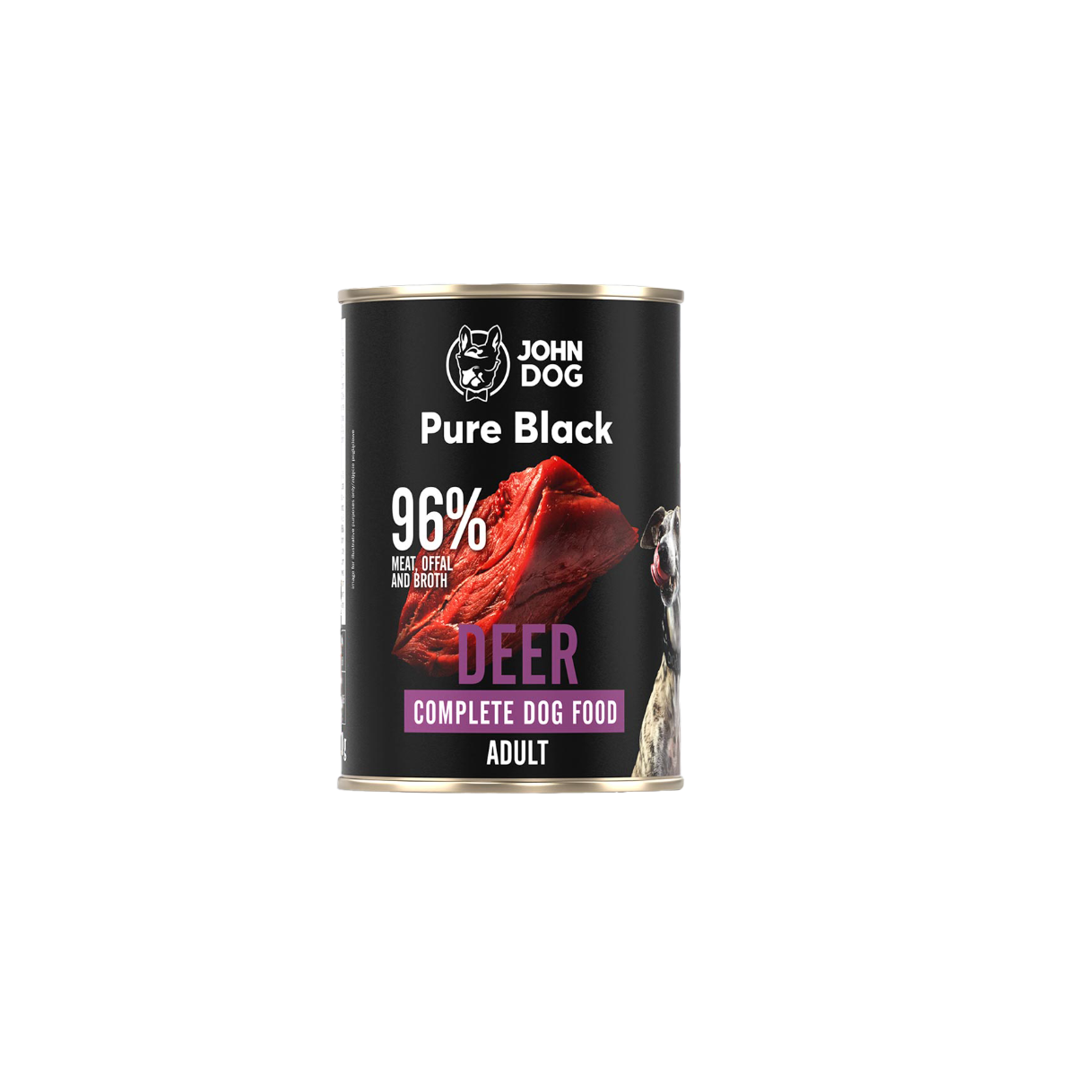 Mokra karma John Dog Pure Black 400 g to karma oparta na składnikach najwyższej jakości dedykowana dla szczeniąt. Zawartość puszki opiera się w 93 % na mięsie z jelenia oraz jego podrobach, z dodatkiem borówki, mniszka lekarskiego oraz drożdży piwnych.