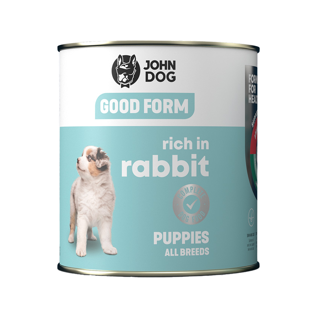 JOHN DOG GOOD FORM Królik 800 g to pełnoporcjowa karma dla szczeniąt wszystkich ras psów, zamknięta w wygodnej puszce. Skład karmy oparty jest na mięsie z królika oraz wieprzowiny, bez dodatków mięsa drobiowego ani jego podrobów.