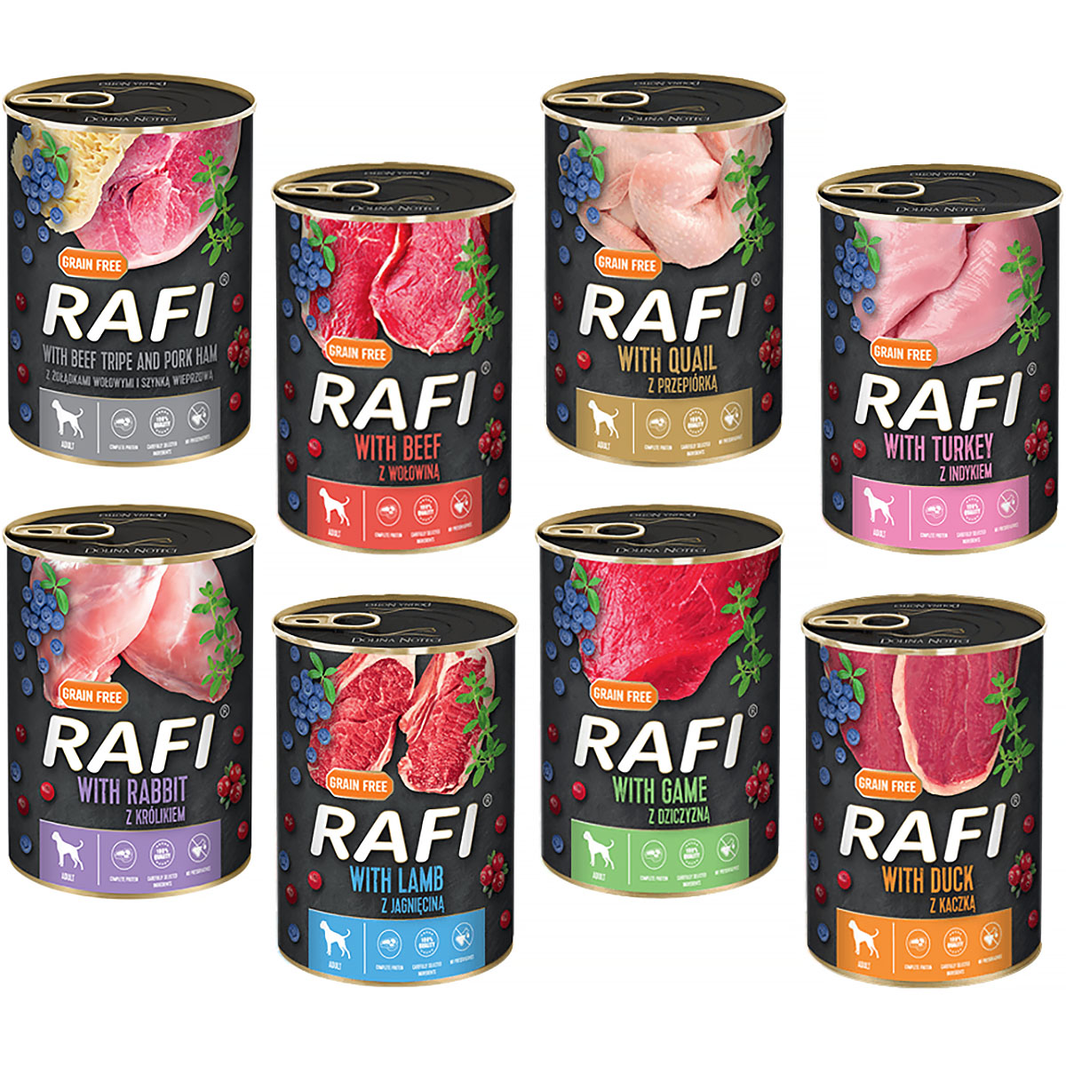 Mokra karma dla psa RAFI to pełnowartościowe posiłki dla Twojego pupila, które dostarczają mu wiele witamin, minerałów i składników odżywczych niezbędnych do prawidłowego funkcjonowania organizmu. Bezzbożowa karma dla psa Rafi ma wysoką zawartość mięsa, co wpływa na lepsze trawienie. Karmy w zestawie to 8 pysznych smaków: żołądki wołowe z szynką, wołowina, przepiórka, indyk, kaczka, królik, jagnięcina i dziczyzna. Każdy z tych smaków z pewnością zasmakuje wszystkim pupilom.