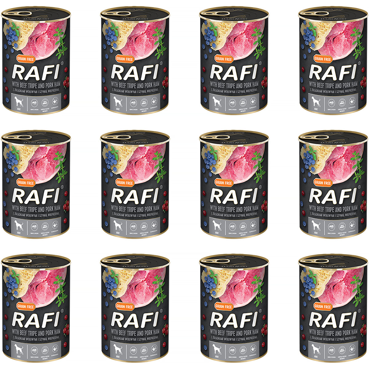 Mokra karma dla psa RAFI z żołądkami wołowymi i szynką to pełnoporcjowy posiłek dla dorosłych psów wszystkich ras. Bezzbożowy skład z wysoką zawartością mięsa jest zdrowy oraz dostarcza psu wszystkich niezbędnych witamin, minerałów i składników odżywczych. Dodatkowo mokra karma Rafi jest pyszna i chętnie zjadana przez psy, a zestaw 12 puszek gwarantuje im zapas ulubionego jedzenia na dość długi czas.