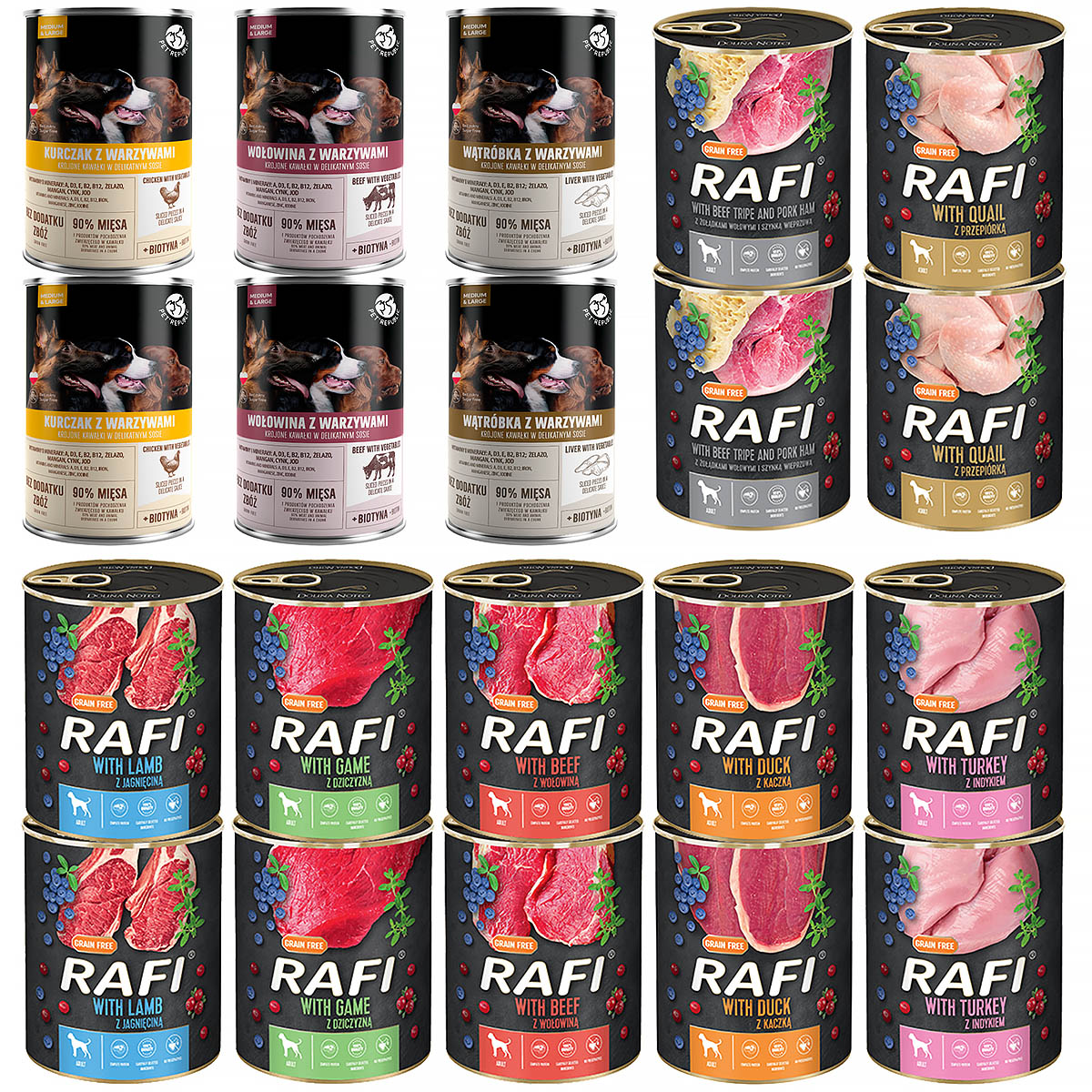 Mokre karmy dla psów RAFI i PetRepublic w puszkach o pojemności 800g. W zestawie znajduje się 20 puszek karmy w różnych smakach.