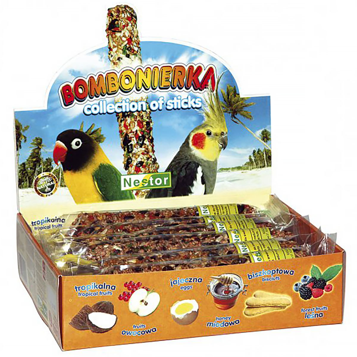 Wydziobywanie ziaren z kolby to ich pierwotny nawyk pochodzący z naturalnego środowiska. W klatce to dla nich również forma doskonałej zabawy. Bombonierka Nestor zawierająca różne smaki uatrakcyjni dietę papug.