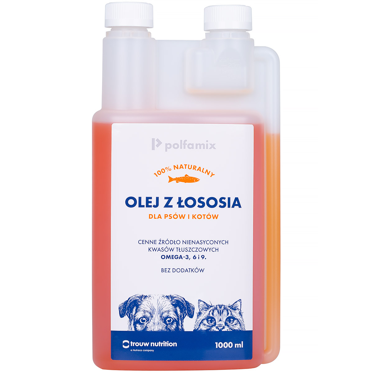 Polfamix Olej z łososia to dodatek do diety psów i kotów, który zawiera korzystne składniki odżywczych w postaci kwasów tłuszczowych omega-3, , 6 i 9. Olej jest produktem naturalnym i pochodzi z nieprzetworzonych ryb.
