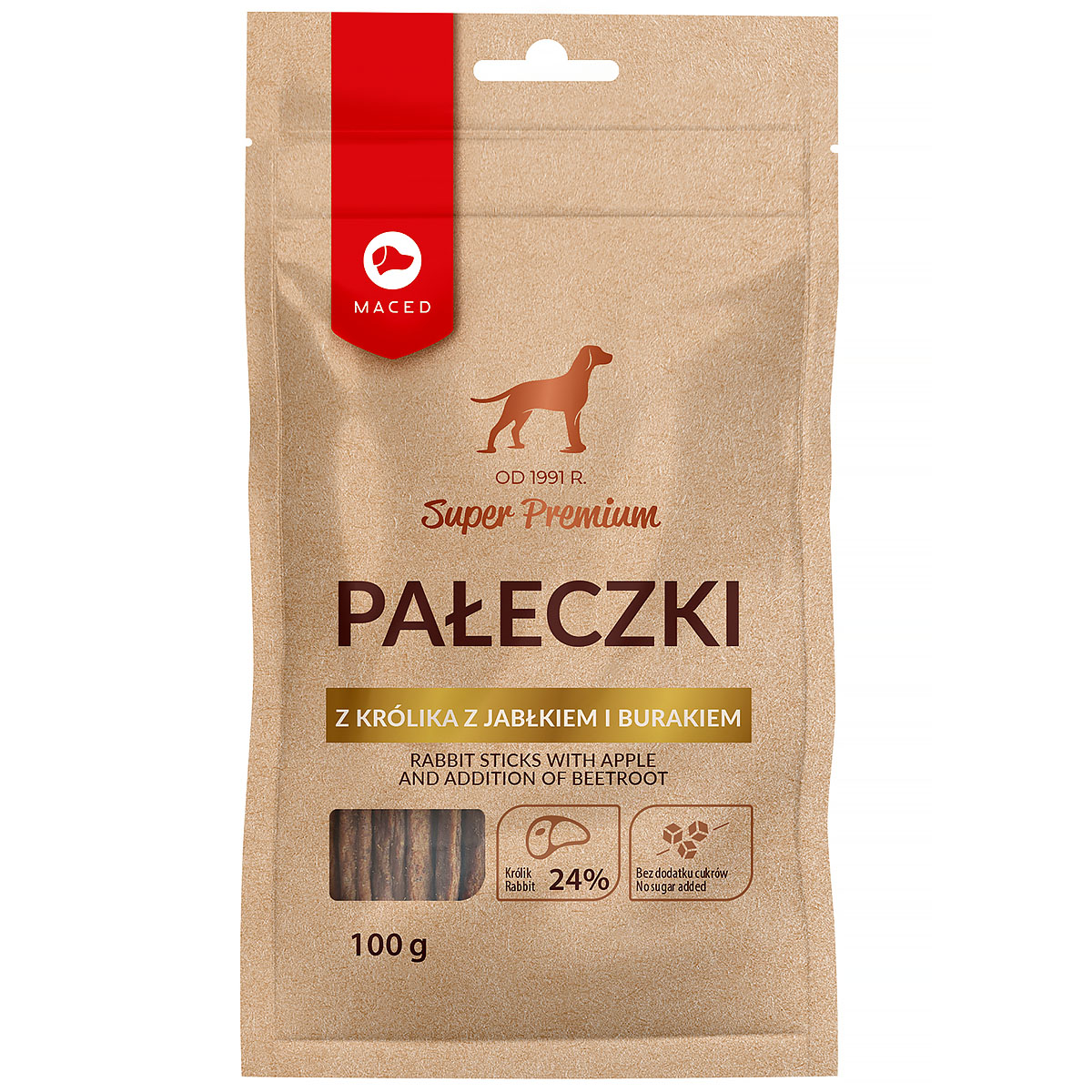 Pałeczki dla psa Maced to wyrafinowany przysmak dla psa z królika z dodatek jabłka oraz buraka. Niezwykły smak zapewnia odpowiednia receptura smakołyku, ale przede wszystkim na smakowitość ma wpływ wysoka zawartość mięsa z królika - 24 %. Odpowiednio dobrana receptura to również gwarancja zdrowej diety psa. Królik jest lekkostrawny, cenny w pełnowartościowe białko oraz zawiera małą ilość tłuszczu. Mięsne pałeczki dla psa dostarczają również wielu witamin i składników mineralnych.
