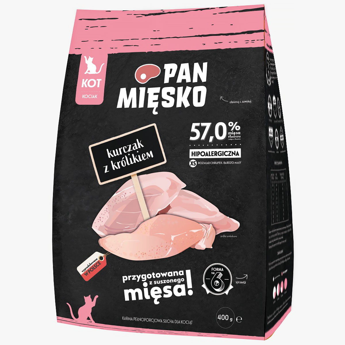 Pan Mięsko 400 g to pełnoporcjowa karma dla kociąt. Karma sucha Pan Mięsko dla kociąt opiera się na składzie najwyższej jakości - mięsie z kurczaka oraz królika, wzbogaconych o naturalne ziołowe dodatki. Mięsko z kurczaka jest bogate w cynk i dobrze przyswajalne białko. Natomiast mięso królicze jest delikatne i lekkostrawne, dostarczając ważną witaminę D. Karma Pan Mięsko dla kociąt jest hipoalergiczna - polecana dla kotów z alergiami pokarmowymi.