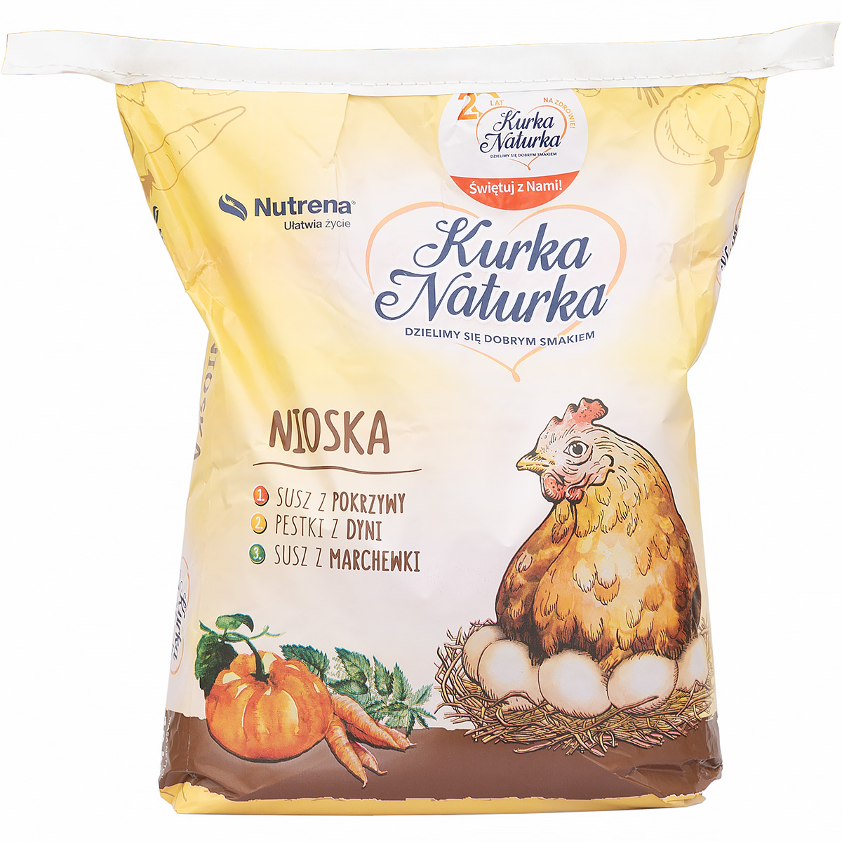 Zbilansowana pasza dla niosek Kurka Naturka o bogatym składzie. Kruszonka dla niosek 10 kg zawiera m. in. susz z pokrzywy, pestki dyni, susz z marchewki, wyciąg z ziół oraz kukurydzę i soję.