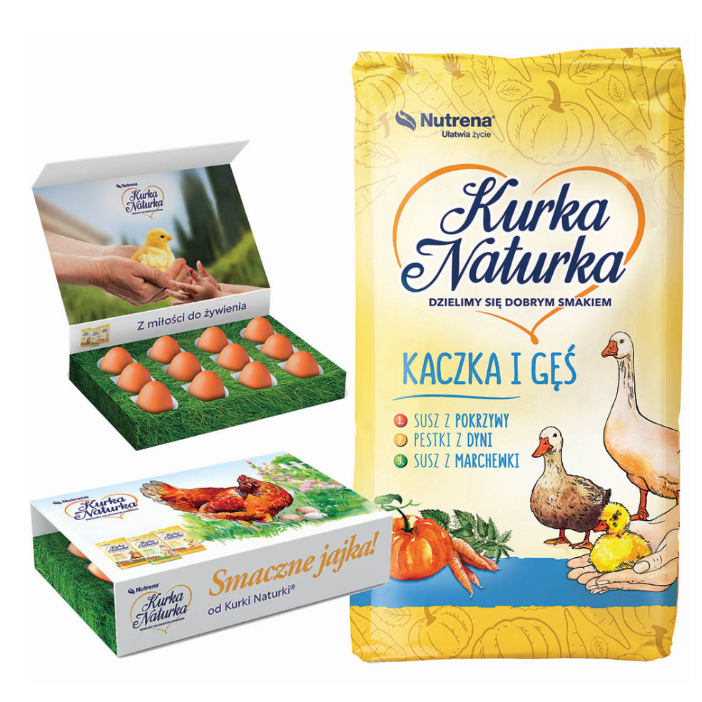 Pasza dla piskląt kaczek i gęsi od 0-6 tygodnia, opakowanie 25 kg. Pasza Nutrena "Kaczka i Gęś 1" dedykowana jest dla najmłodszych kacząt i gąsiąt w formie kruszonki. Pełnoporcjowa pasza startowa zawiera susz z pokrzywy, dyni i marchewki, dzięki czemu od pierwszych dni życia wzmacnia się odporność piskląt, układ kostny, poprawia upierzenie. Pasza kurka naturka zapewnia dobre przyrosty oraz lepszą jakość żółtek i mięsa. Skład: kukurydza, śruta poekstrakcyjna sojowa (toastowana), otręby pszenne, pszenica, pszenżyto, wywar gorzelniany zbożowy suszony (kukurydziany), śruta poekstrakcyjna paszowa z nasion rzepaku, węglan wapnia, fosforan jednowapniowy, oleje i tłuszcze roślinne (sojowy), chlorek sodu, nasiona dyni i dyniowatych, marchew suszona, produkty przetwarzania ziół (pokrzywa). Składniki analityczne: