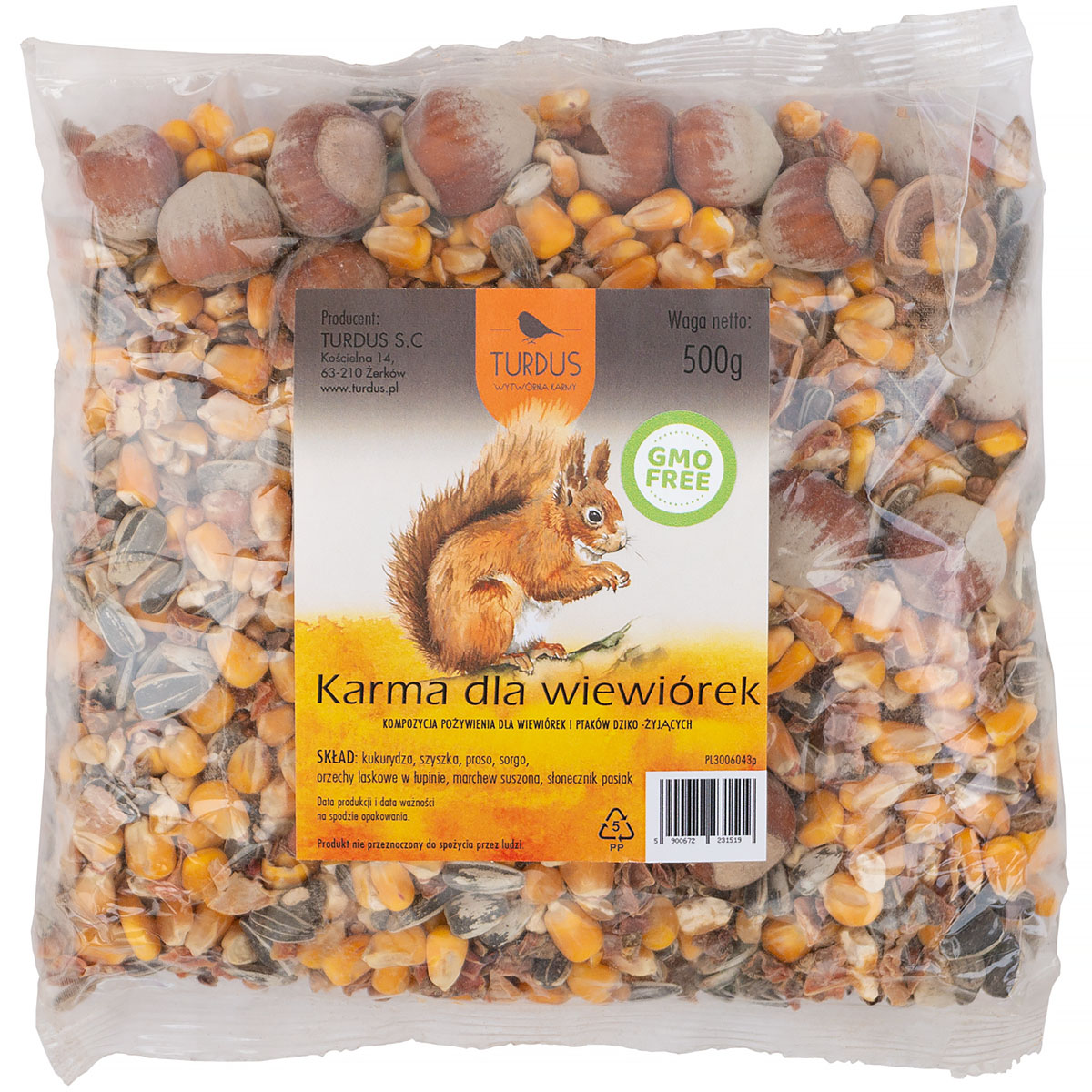 Karma dla wiewiórek zawiera orzechy laskowe, kukurydzę, marchew suszoną, słonecznik pasiak proso i sorgo Mieszanka jest wolna od GMO. Może być również spożywana przez dzikie ptaki.