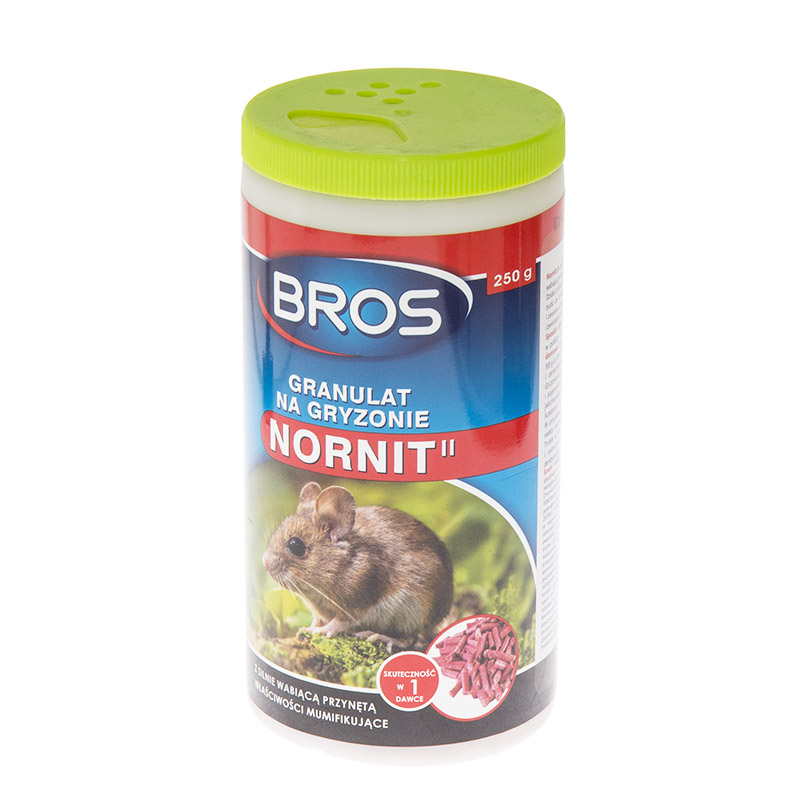 Sposób użycia: Granulat rozprowadzić w porcjach 20-25 g w korytarzach, norach, ich sąsiedztwie, a także po ścieżkach przebiegu nornic. Charakterystyczny, bardzo gorzki składnik chroni ludzi i inne zwierzęta przed przypadkowym spożyciem.