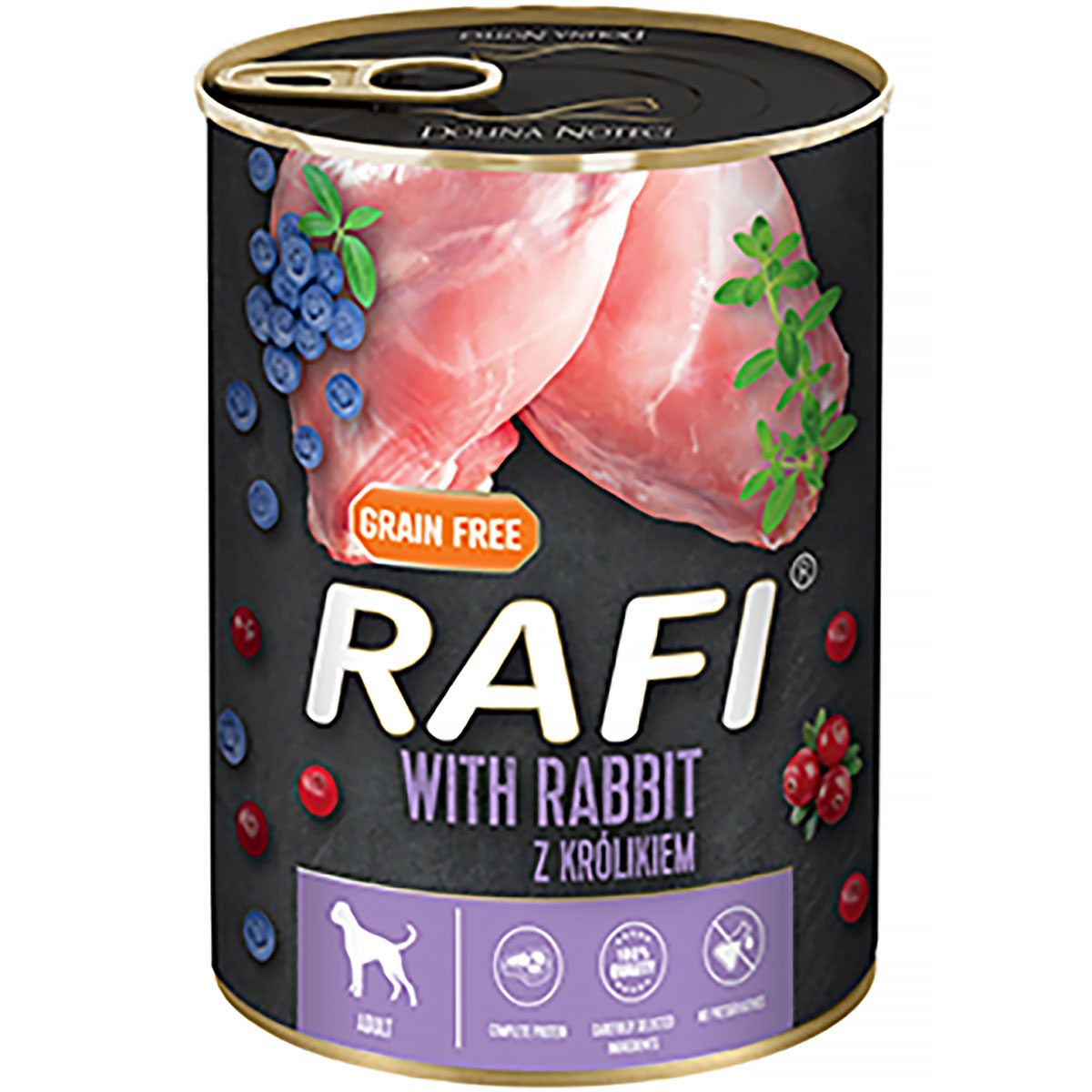 Skład: mięso i produkty pochodzenia zwierzęcego 65% (mięso z królika 4%), owoce (borówka amerykańska