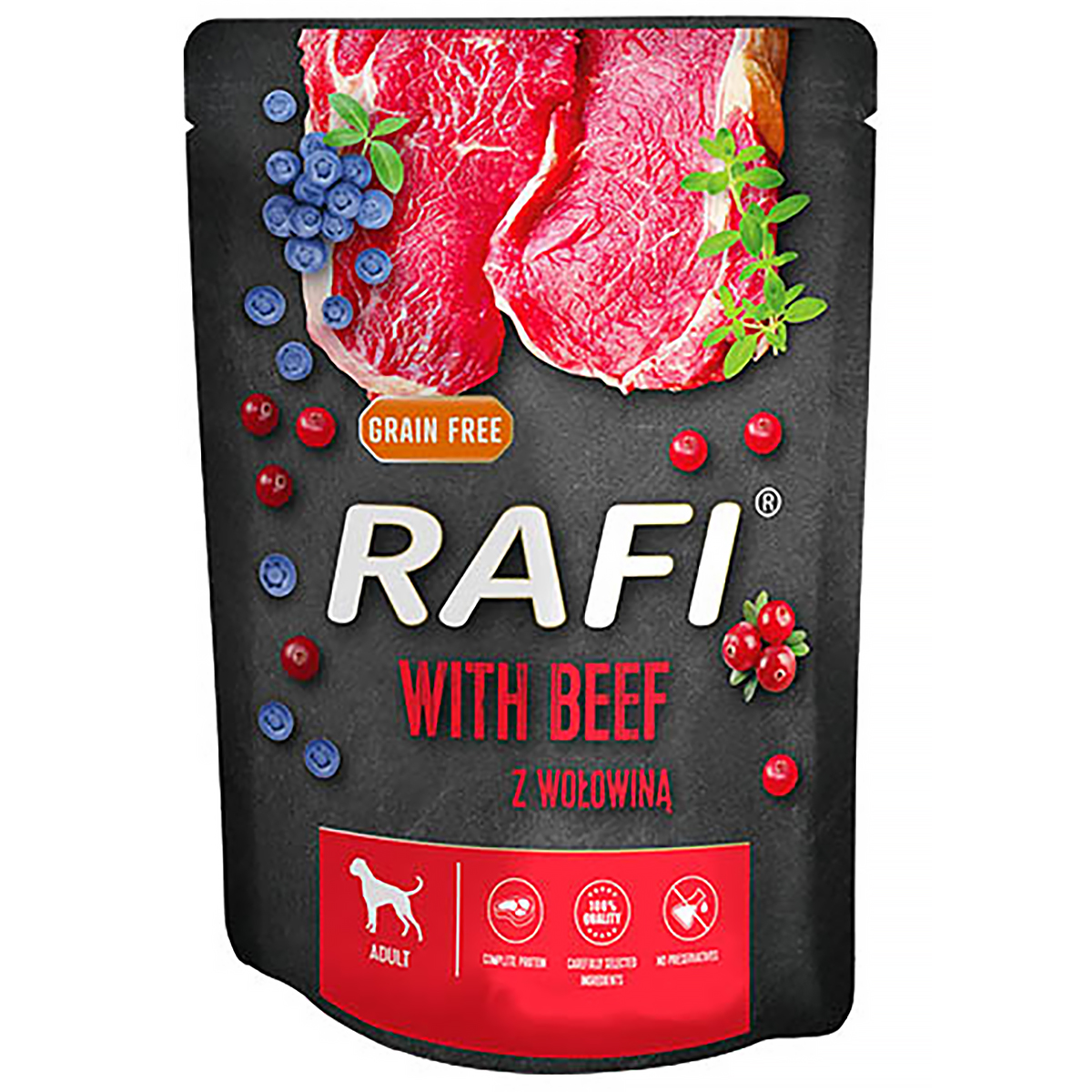 Karma Rafi zawiera dodatki owoców borówki, żurawiny, z także ziół tymianku, które gwarantują atrakcyjny smak karmy. Dodatki do karmy pozytywnie wpływają na układ trawienny i zapewniają zdrowy wygląd psa.