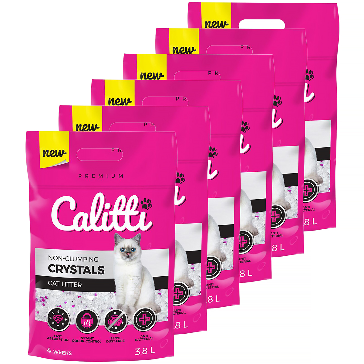 Calitti Crystals zestaw żwiru dla kota obejmuje 6 opakowań żwirku silikonowego o pojemności 3,8 L. Tak duży zestaw wystarczy na długi okres użytkowania. Calitti silikonowy jest wydajny i wystarcza na 2-4 tygodni. Drobne granulki zwirku silikonowego nie przyklejają się do kocich łapek, dlatego nasz dom pozostanie czysty i higieniczna. Wysoką jakość żwirku silikonowego zapewnia formuła DUST FREE (żwirek bezpyłowy).