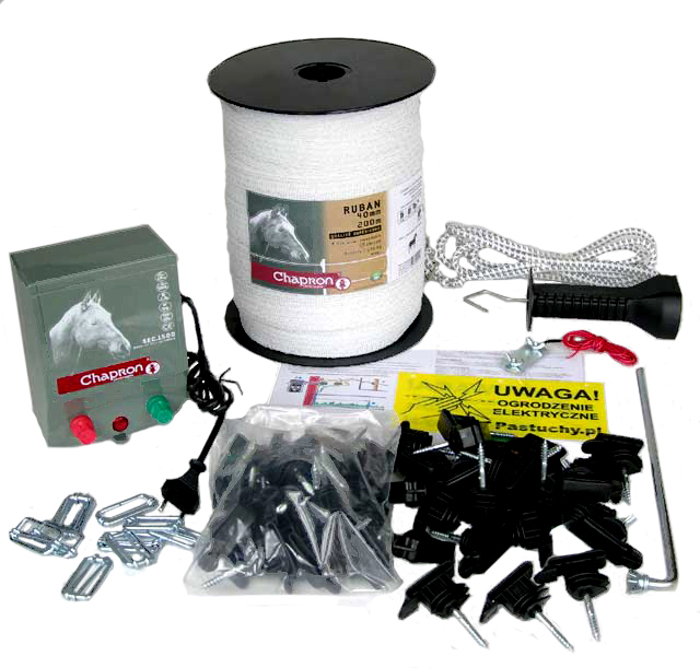 Istotną kwestią podczas budowy ogrodzenia elektrycznego dla koni stanowi siła impulsu generowanego przez elektryzator. Z uwagi, iż zwierzęta te są wrażliwe na bodźce elektryczne ogrodzenie nie powinno wzbudzać zbyt dużego szoku, a jedynie nauczyć respektu w stosunku do ogrodzenia. Oferowany zestaw składa się z najistotniejszych elementów niezbędnych przy konstruowaniu skutecznego pastucha dla koni. Niniejszy komplet zastosować można również przy budowie pastucha dla psów, kotów czy drobiu. Zestaw wyposażony jest w profesjonalny elektryzator sec. 1500 dla koni francuskiej firmy CHAPRON. Wytwarzane przez urządzenie napięcie wyładowania sięga 5000V. Moc generowanego przez elektryzator impulsu liczy