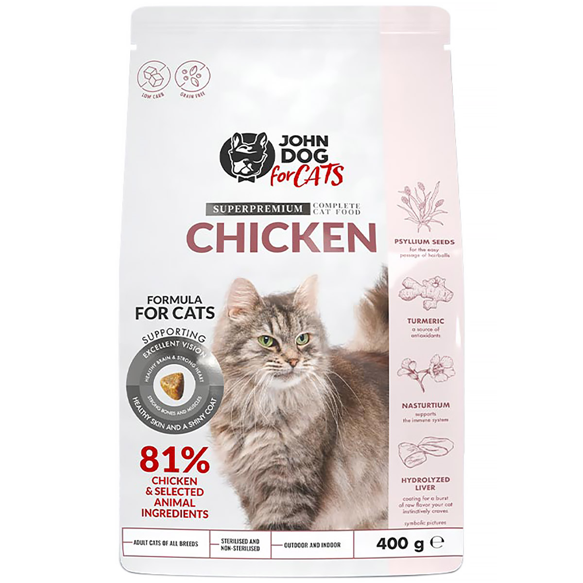 John Dog for Cats kurczak 400 g to sucha karma najwyższej jakości dedykowana dla dorosłych kotów wszystkich ras. Może stanowić uzupełnienie codziennej diety naszych pupili.