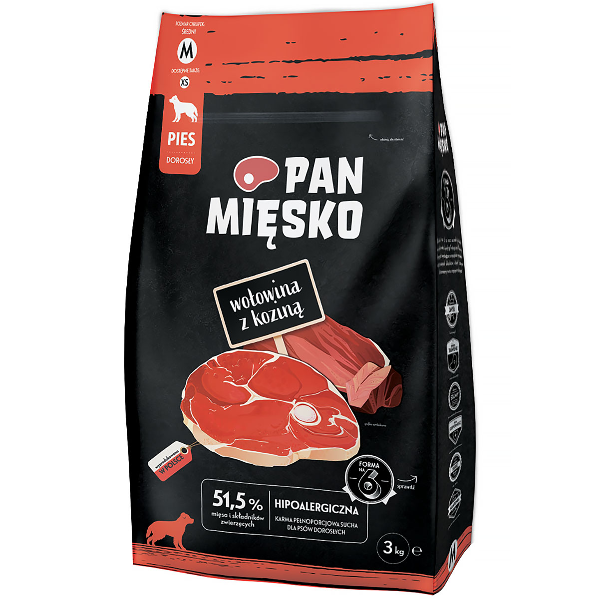 Sucha karma dla psa Pan Mięsko wołowina z koziną w opakowaniu 3 kg, to starannie opracowany pełnowartościowy posiłek przeznaczony dla psów dorosłych, a chrupka w rozmiarze M świetnie się sprawdzi zarówno dla małych ras jak i dużych. Receptura karmy opiera się na wysokiej jakości wołowinie oraz delikatnej kozinie, które są źródłem doskonale przyswajalnego białka zwierzęcego, niezbędnego do utrzymania prawidłowej masy mięśniowej i dobrej kondycji organizmu psa. Sucha karma Pan Mięsko została uzupełniona o starannie dobrane warzywa i owoce, które dostarczają witamin, minerałów oraz naturalnych przeciwutleniaczy wspomagających odporność.