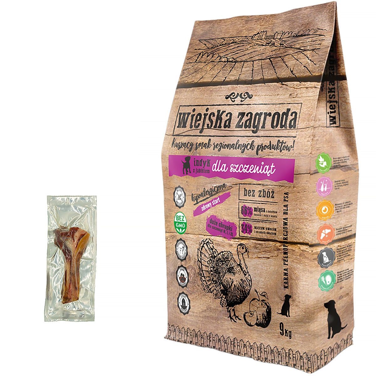 Sucha karma dla szczeniąt Wiejska Zagroda indyk z jabłkiem to pełnowartościowy posiłek dla Twojego pupila, który dostarczy mu witamin, minerałów i składników odżywczych niezbędnych do prawidłowego wzrostu i rozwoju. Wiejska Zagroda dla szczeniąt nie zawiera konserwantów i sztucznych dodatków więc jest zdrowa. Dodatkowo, pyszny smak indyka, jagnięciny i jabłek jest chętnie zjadany nawet przez wybredne szczeniaki. Średni rozmiar granulek sprawdzi się u średnich i dużych ras. Hipoalergiczna formuła świetnie sprawdzi się dla psiaków z alergiami i nietolerancjami pokarmowymi.