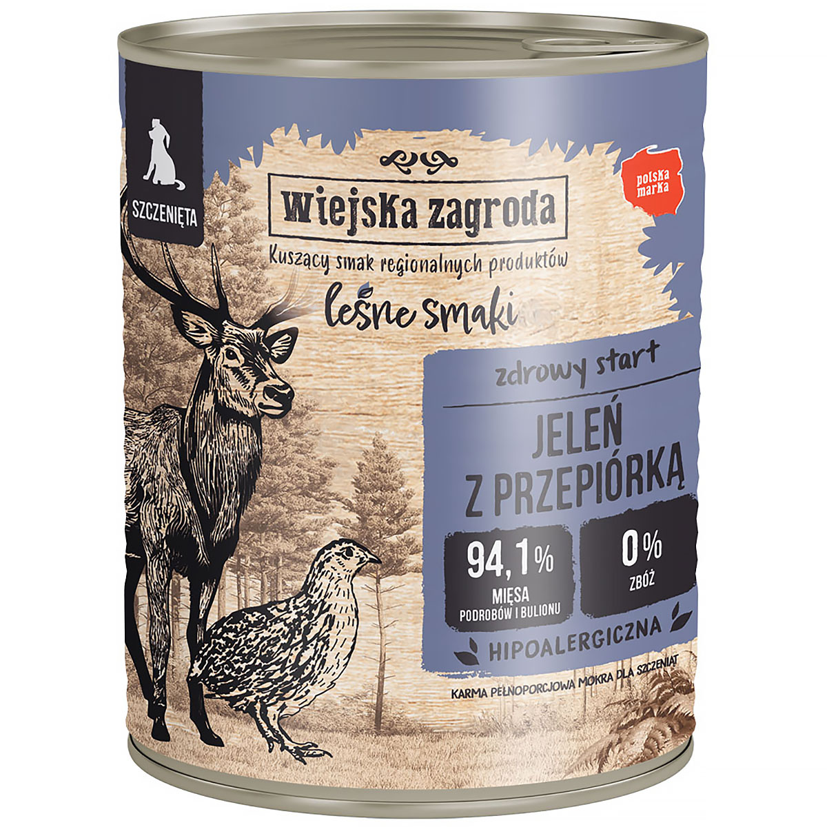 Mokra karma dla psa Wiejska Zagroda Leśne Smaki jeleń z przepiórką w puszce 800 g.
