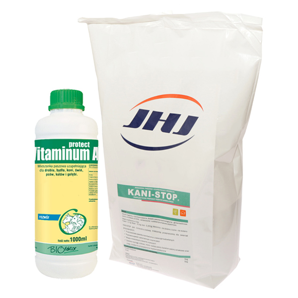 przeciwdziała kanibalizmowi oraz zmniejsza agresję wśród zwierząt, wpływa na wzrost apetytu, a także poprawia wykorzystanie paszy, wspomaga odporność oraz poprawia kondycję fizyczną zwierząt, wpływa na walory smakowe paszy, wzbogaca paszę oraz uzupełnia ją w mikro i makroelementy. Dawkowanie: 5 kg preparatu na 1 tonę paszy preparat przeciw kanibalizmowi przynosi efekty już po 3 dniach podawania Skład: związki magnezu, beta-karoten pochodzenia naturalnego, wyciągi ziołowe, naturalne glinokrzemiany 2. VITAMINUM A PROTECT 1000 ml to preparat stosowany w celu wzbogacenia diety zwierząt hodowlanych w witaminę A, która jest szczególnie ważna w okresie po przebytych chorobach oraz w okresie zwiększonego stresu. Dodatek Vitaminum A Protect przeciwdziała również zachowaniom tj. kanibalizm oraz zachorowaniom na kurzom ślepotę. Skład Vitaminum A Protect (w 1 litrze): - glikol propylenowy,- chlorek sodu,- witamina A 50 mln j.m.,- DL-metionina technicznie czysta 5 g, lizyna 5 g,- rycynolan gliceryno-polietylenoglikolu 15 - butylo-hydroksytoluen 1g. Dawkowanie: podawać w wodzie pitnej, w dawce: - drób 100 ml / 1000 litrów wody,- prosięta 12 ml / 100 litrów wody, - tuczniki 5 ml / 100 litrów wody, - maciory 10 ml / 100 litrów wody, - krowy mleczne, owce, kozy 4 ml / 100 litrów wody, - cielęta 12 ml / 100 litrów wody.
