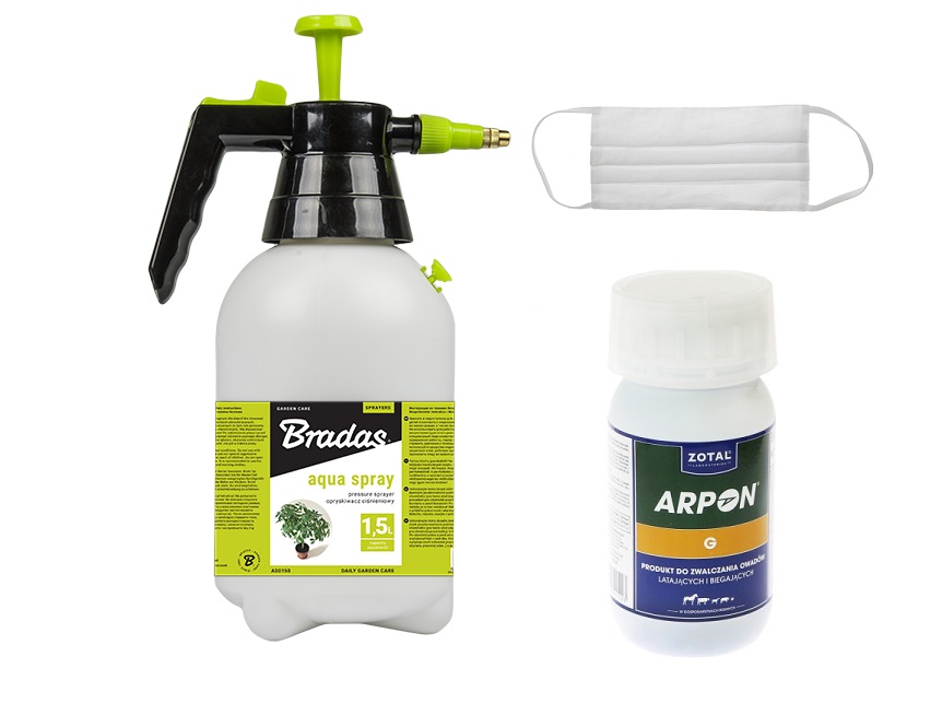 Skuteczny zestaw do zwalczania wszelkich owadów, które występują w gospodarstwach rolnych. W komplecie znajduje się środek Arpon G w opakowaniu 250 ml, opryskiwacz 1,5 l oraz maseczka na twarz.