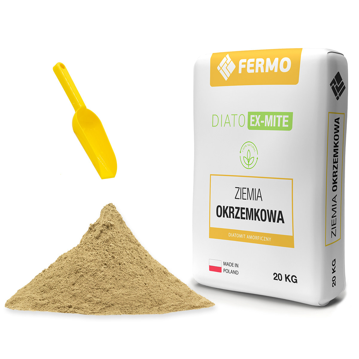 Ziemia okrzemkowa w dużym opakowaniu 20 kg. Jest to naturalna i skuteczna posypka stosowana w hodowli zwierząt oraz w uprawach ogrodowych jako nawóz.