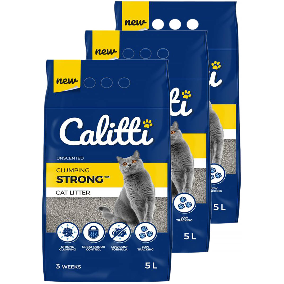 Bentonitowy żwirek dla kota Calitti Strong 15 L bezzapachowy. W zestawie znajdują się 3 opakowania żwirku o pojemności 5 l każdy.